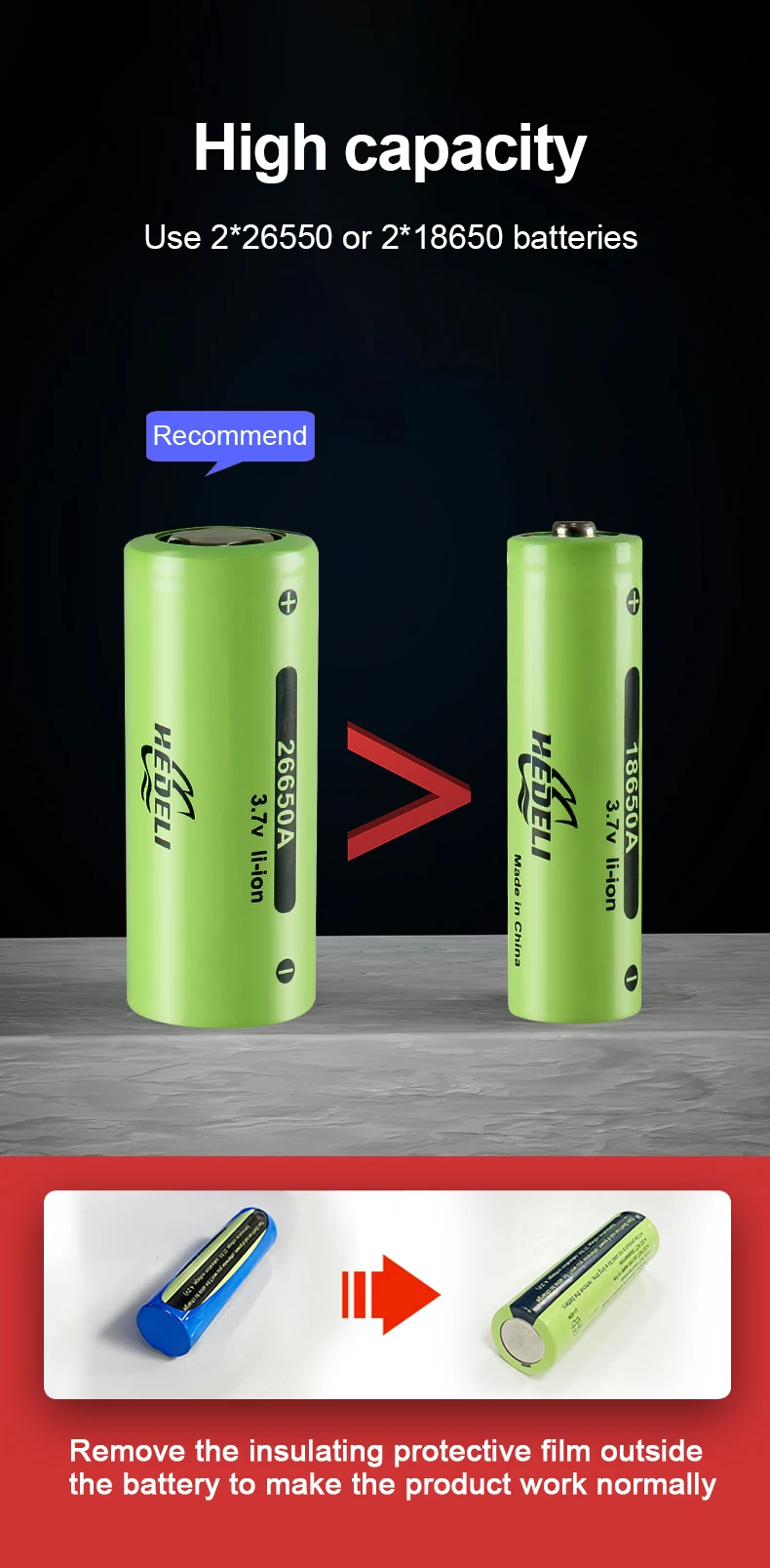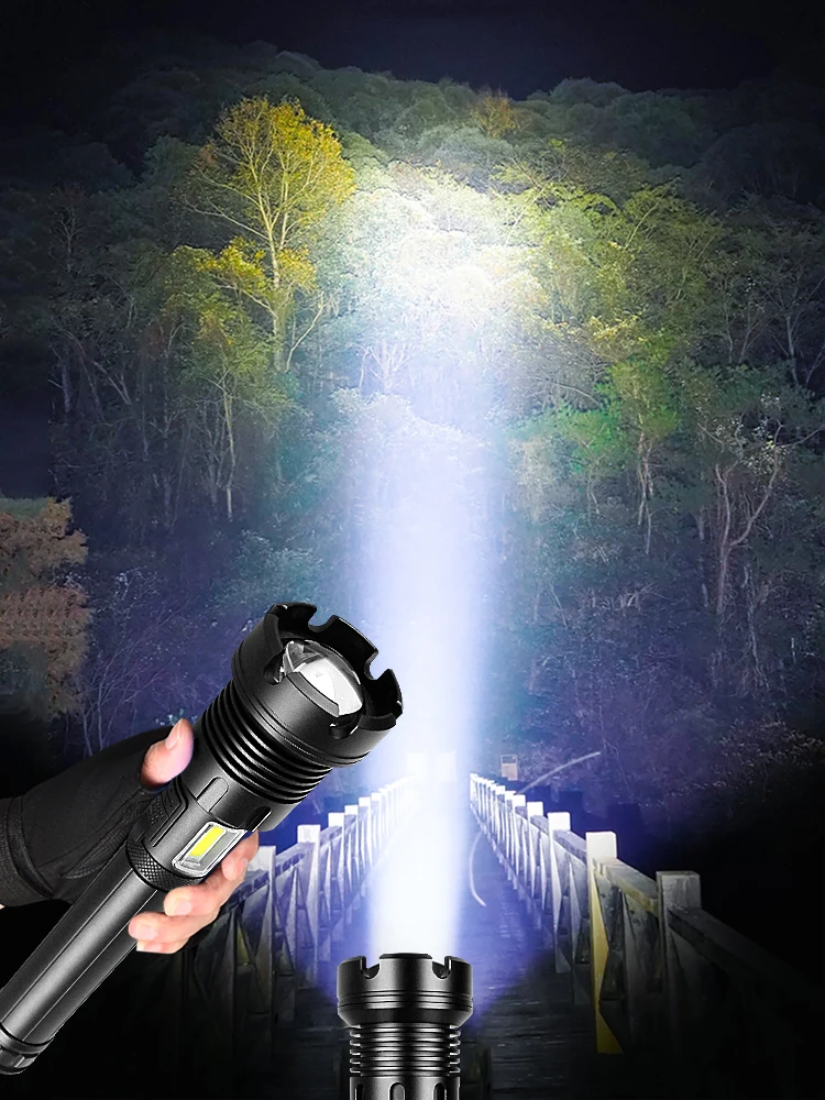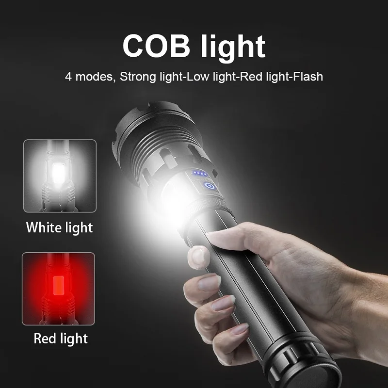 • Люмен: 900000 люменов• Режим переключения: 7 режимов (High - Low - SOS + 4 * COB лампы)• Уровень водонепроницаемости: IPX-8• Мощность: 2 аккумулятора 18650 или 2 аккумулятора 26650• Время освещения: 2 аккумулятора 18650 6-8 часов; 2 аккумулятора 26650: 8-15 часов• Аккумулятор емкостью 8600 мА · ч, с аккумулятором 2*18650 or2 * 26650. Внутренняя проводка использует высокоэффективную схему повышения для максимального использования аккумулятора. Он длиннее и прочнее обычных батарей.• Цвет излучения: белый светильник• Режим масштабирования: телескопический зум• Материал корпуса: алюминиевый сплав• Размеры (см): 26,5*6*3,5 см• Дисплей питания: Да• COB: дважды нажмите кнопку питания, чтобы включить режим COB.• Способ зарядки: зарядка через USB (вход и выход, с функцией мобильного питания, можно заряжать мобильные телефоны)• Подходит для ночного кемпинга, рыбалки, работы, охоты, пеших прогулок, катания, приключений и т. д.