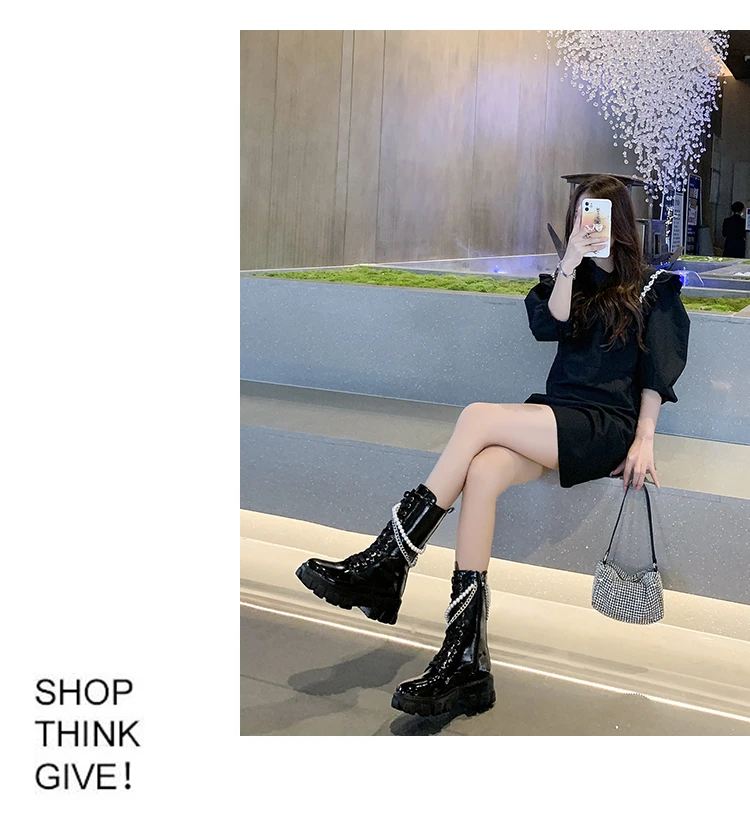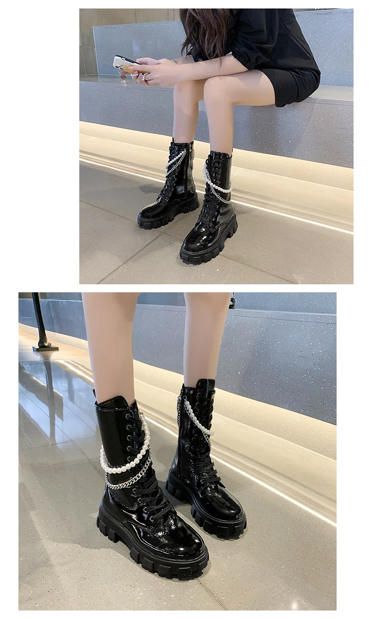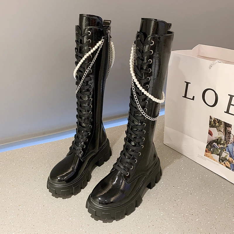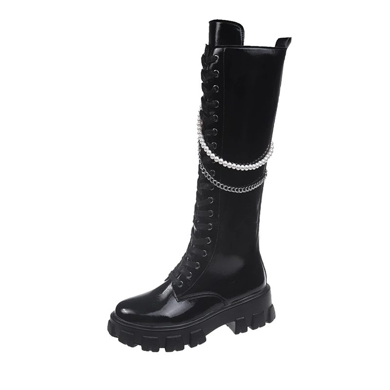 Женские сапоги на молнии, черные высокие сапоги на платформе, с жемчужной цепью, с круглым носком, новинка зимы 2021