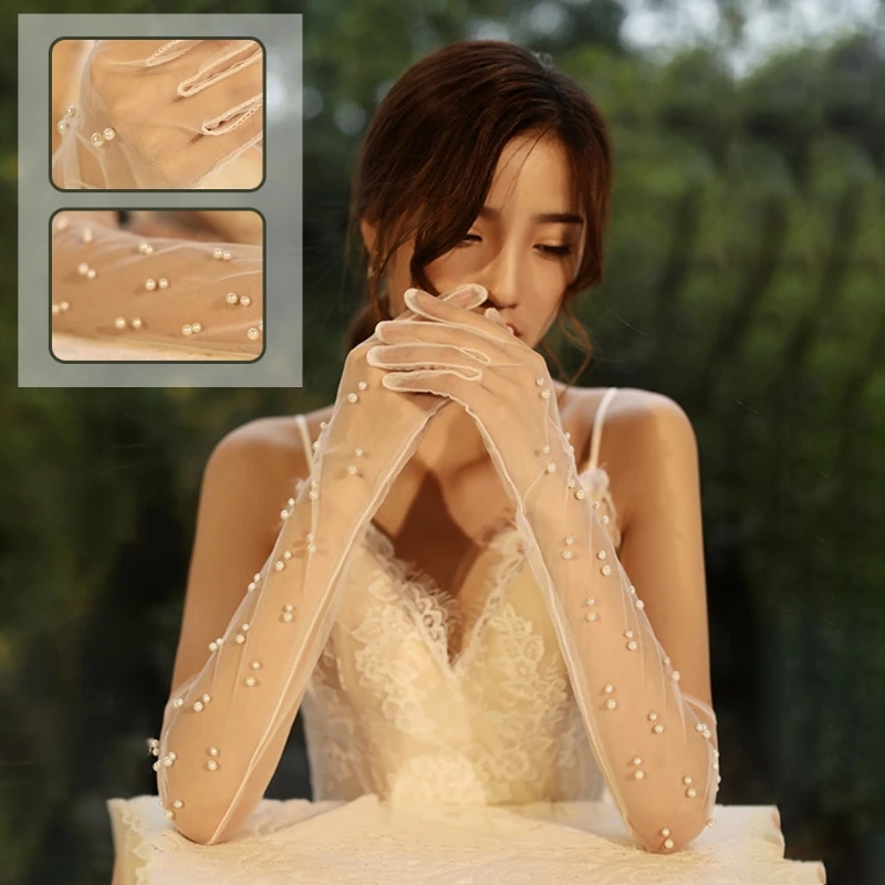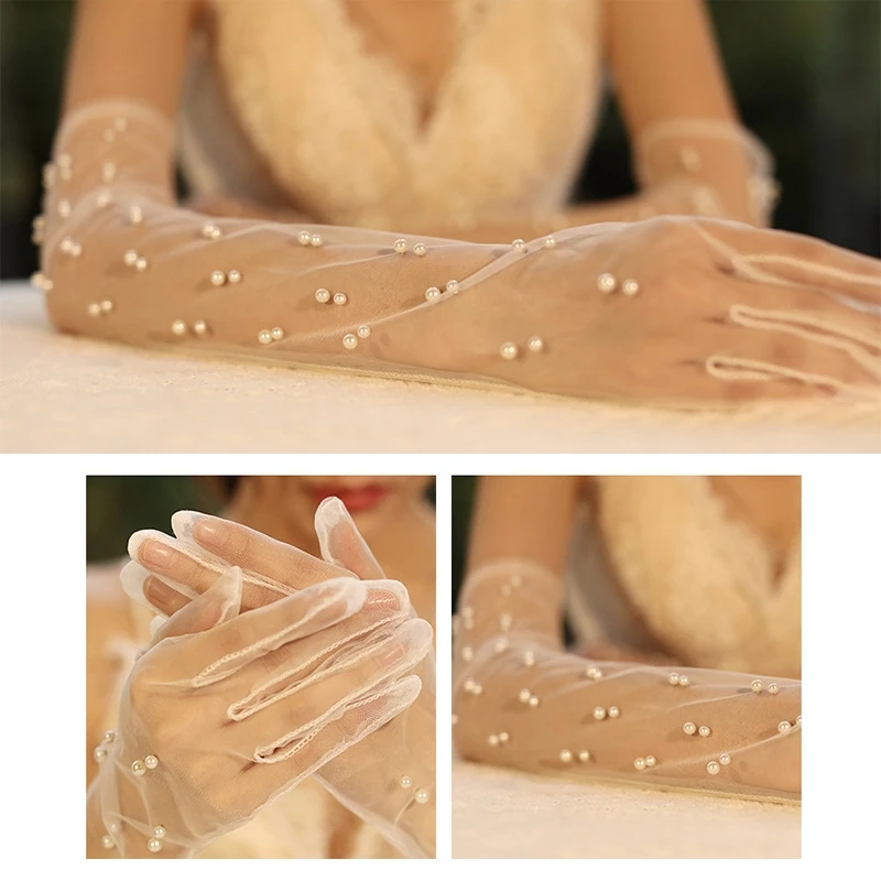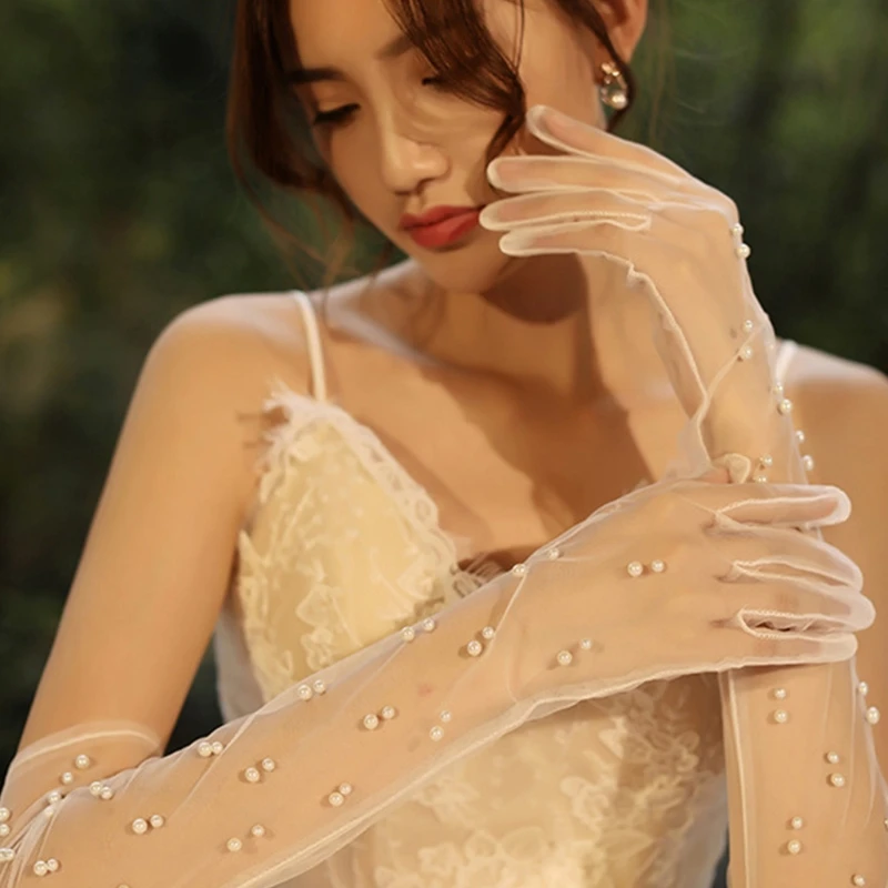 Свадебные перчатки, белые тюлевые с жемчугом, длинные перчатки для опервечерние, 22 дюйма, длина локтя, свадебные прозрачные перчатки для банкета