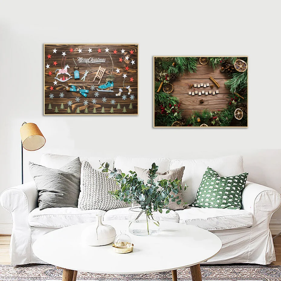 Рождественская Картина на холсте Рождественская елка Гирлянда деревянная доска фон Картина на холсте настенный художественный плакат картины Домашний декор