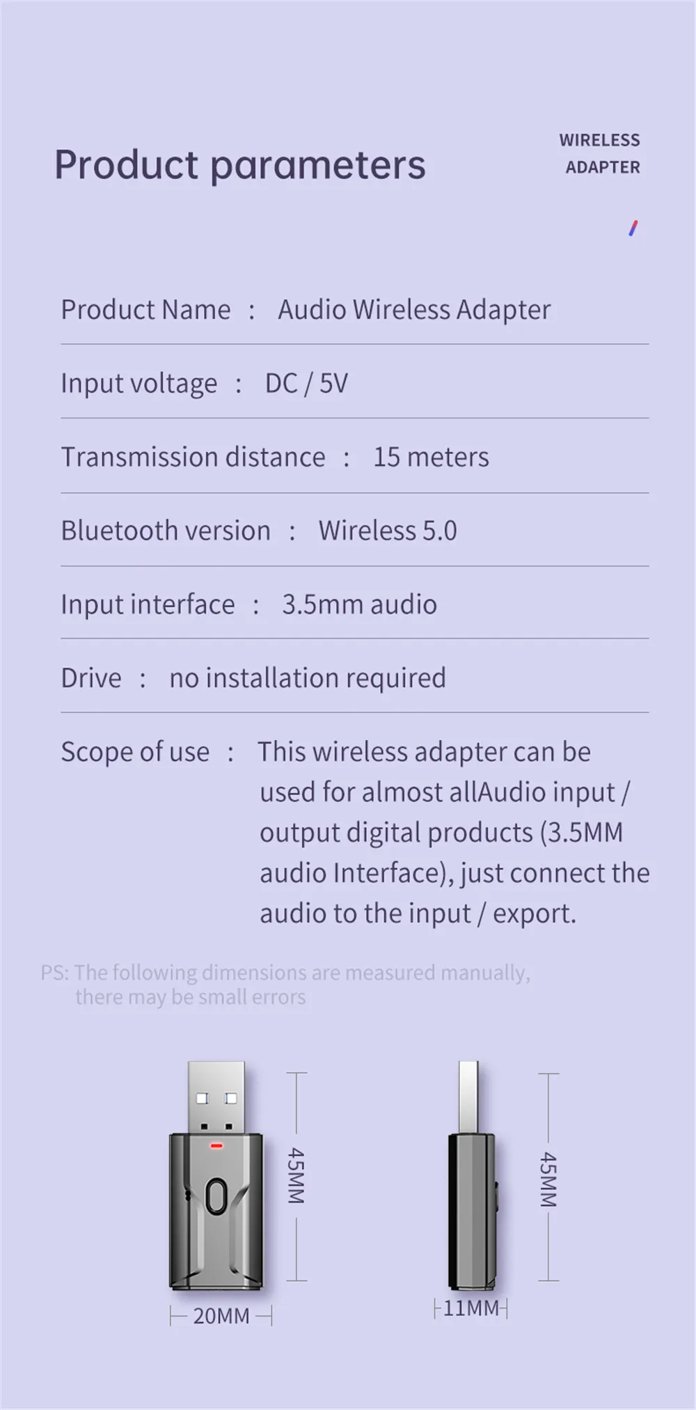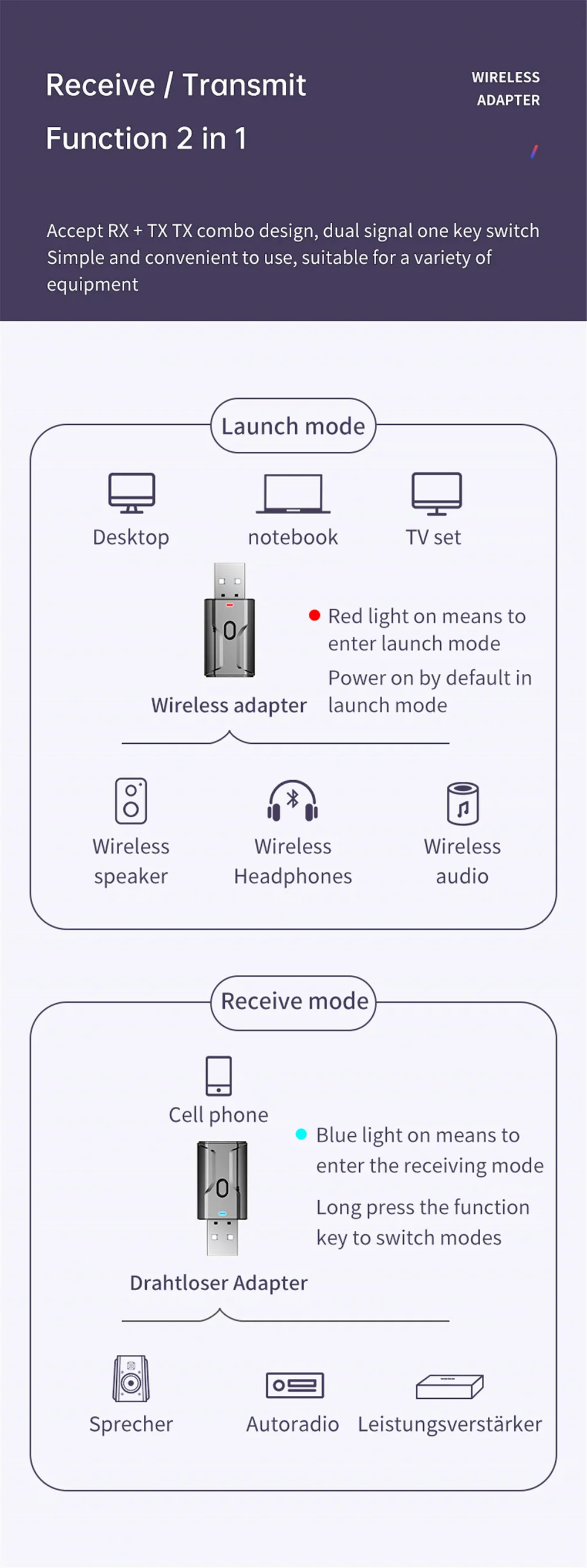 Этот портативный, легкий беспроводной аудио передатчик и приемник является идеальным беспроводным аудио решением для каждой ситуации и приложения, и может использоваться с компьютерами, мобильными телефонами, телевизорами, домашними колонками и автомобильными колонками. Используйте новейшие технологии Bluetooth 5,0, быструю скорость передачи, высококачественную стерео музыку, наслаждайтесь удобством технологии Bluetooth на всю жизнь.