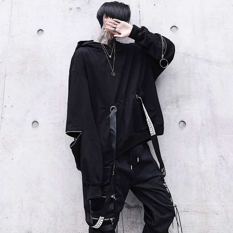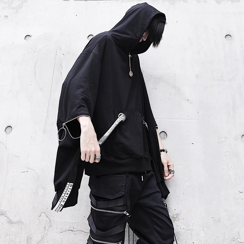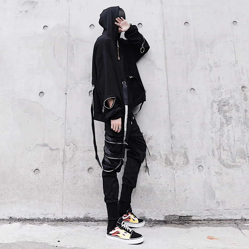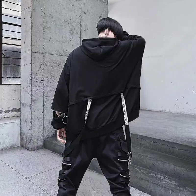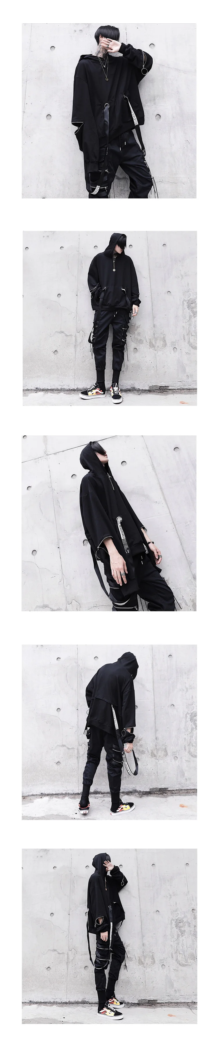 Мужской костюм с капюшоном, черная толстовка с капюшоном и штаны в стиле панк, свободная уличная одежда большого размера