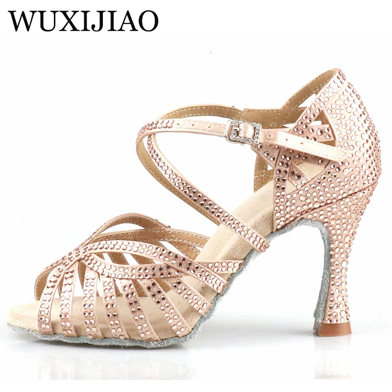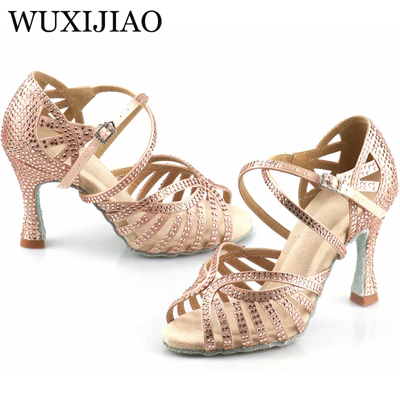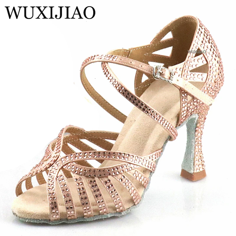 Туфли WUXIJIAO женские для бальных танцев, обувь для латинских танцев, Блестящие Маленькие стразы, черные атласные, бронзовые, на каблуке 9 см, для вечеринок