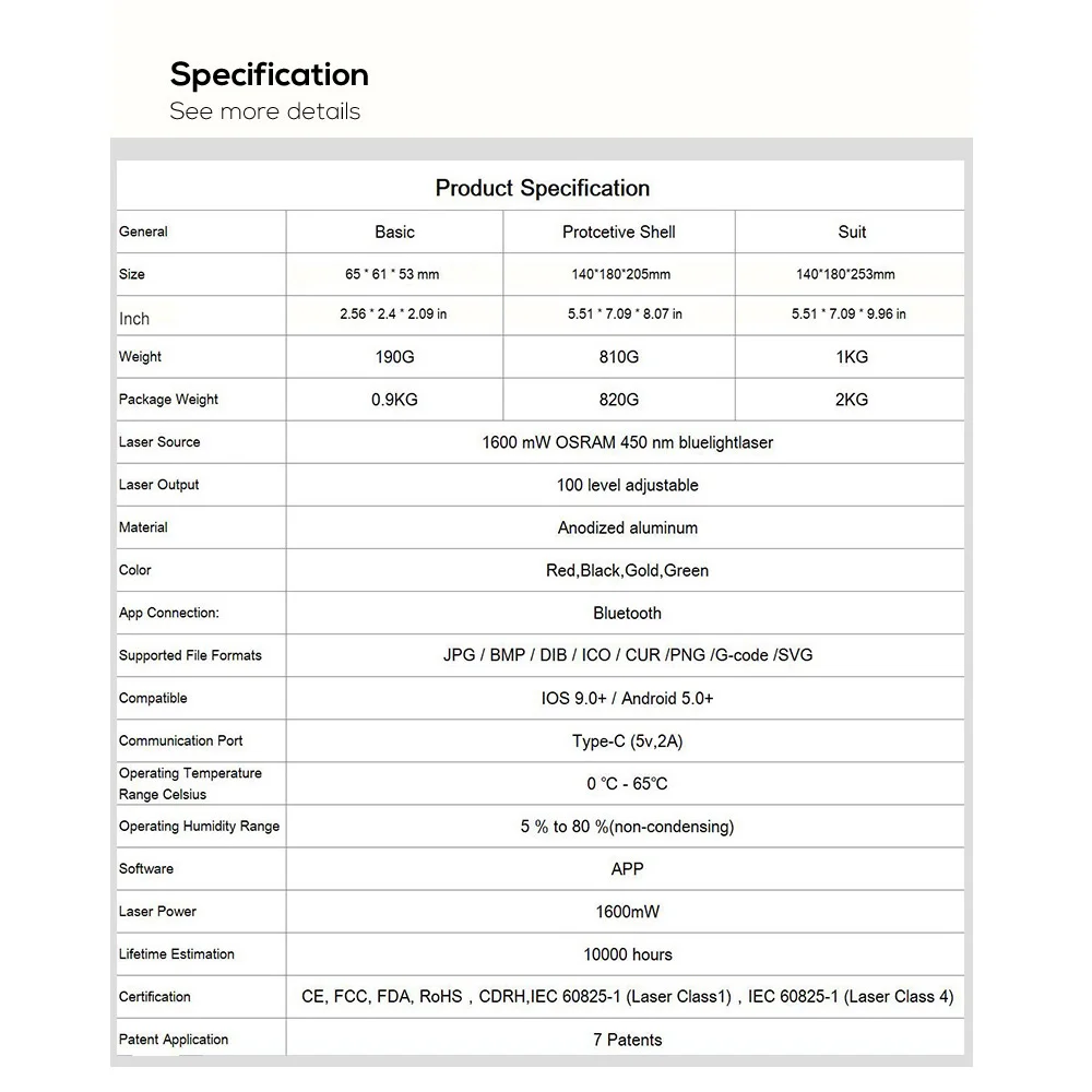 Пункт продажи: 1. Маленький, легкий, 190 г, около половины размера колы, легко носить с собой; 2. Высококачественная лазерная головка, оригинальный 450nm лазер формата blue-Ray источник Osram, Германия, со сроком службы более 10000 часов; 3. Многоугольная гравировка с регулируемым штативом для гравировки изделий под любым углом и высотой; 4. Мощность лазера: 1,6 W; Гравируемая площадь: 10*10 см; 5. Режим работы: используйте мобильный телефон APP, легко управлять, Вы можете DIY любой шаблон, который вы хотите выгравировать; 6. Материалы, которые могут быть выгравированы: дерево, бамбук, бумага, пластик, кожа, резина, губка, расческа, кошелек или другой горючий пластик (например, мобильный телефон чехол, мышь, карандаш, визитная карточка, бумажник, пластиковая расческа); : металл, камень, ювелирные изделия, отражающие материалы, серебро, Белая бумага (астигматизм, плохой эффект), материалы, которые не могут быть сгорели или сфокусированы, такие как металл без какого-либо покрытия, светильник-трансмиссионный пластик, с дополнительным огнезащитным материалом 7. Источник питания: 5 В 2 А (компьютер, зарядное устройство, зарядное устройство USB) для работы источника питания; 8. Сертификация безопасности: CE, FCC, FDA, RoHS, CDRH, IEC 60825-1 (лазерный уровень 1), IEC 60825-1 (лазерный уровень) 9. Поддерживаемые форматы изображений: поддерживаются JPG / BMP / DIB / ICO / CUR / PNG / G-code / SVG и другие форматы; 10. Могут быть выгравированы на изогнутых предметах; Характеристики: Цвет: золотой, черный Размер продукта: 6,5*6,1*5,3 см Вес изделия: 190 г Размер упаковки: 19,5*20,5*7 см Общий Вес упаковки: 740 г Лучшая высота гравировки: расстояние между лазерной головкой и выгравированным предметом составляет около 20 см Площадь Гравировки: 10*10 см Лазерный источник света OSRAM 450nm синий светильник, длительный срок службы, по крайней мере, 10000 часов; Мощность лазера: 1,6 W Внешний вид: анодирование из алюминиевого сплава Управление: мобильное приложение Способ подключения приложения: подключение по Bluetooth Версия Bluetooth: Bluetooth 4,0 и выше Операционная система приложения: Поддержка IOS 9,0 +/Android 5,0 + Входная мощность: type-c (5 В, 2 а) Диапазон рабочих температур: 0 & deg; C ~ 65 & deg; C Диапазон рабочей влажности: 5% ~ 80% (без конденсации конденсата) Сертификация безопасности: IEC60825-1 (Спецификация безопасности лазерного уровня), CE, RoHS, FCC, FDA CDRH регистрация, IEC60825-1 (лазерный уровень 4) Упаковочный лист: 1 * лазерная гравировальная машина 1 * Штатив 1 * защитные очки 1 * линейка 2 * Бумага для образцов 1 * Руководство по эксплуатации Меры предосторожности:1. Материалы, которые могут быть выгравированы: дерево, бамбук, бумага, пластик, кожа, резина, губка, расческа, кошелек или другой горючий пластик (например, мобильный телефон чехол, мышь, карандаш, визитная карточка, бумажник, пластиковая расческа); 2. Материал s, который не может быть вырезан: металл, камень, ювелирные изделия, светоотражающий материал s, серебро, белая бумага (астигматизм, плохой эффект), материал s, который не может быть сгорел или сфокусирован, такие как металл без какого-либо покрытия, прозрачный пластик, с дополнительным сопротивлением горения материала 3. Площадь Гравировки: 10*10 см 4. Расстояние между лазерной головкой и предметом для резьбы: около 20 см