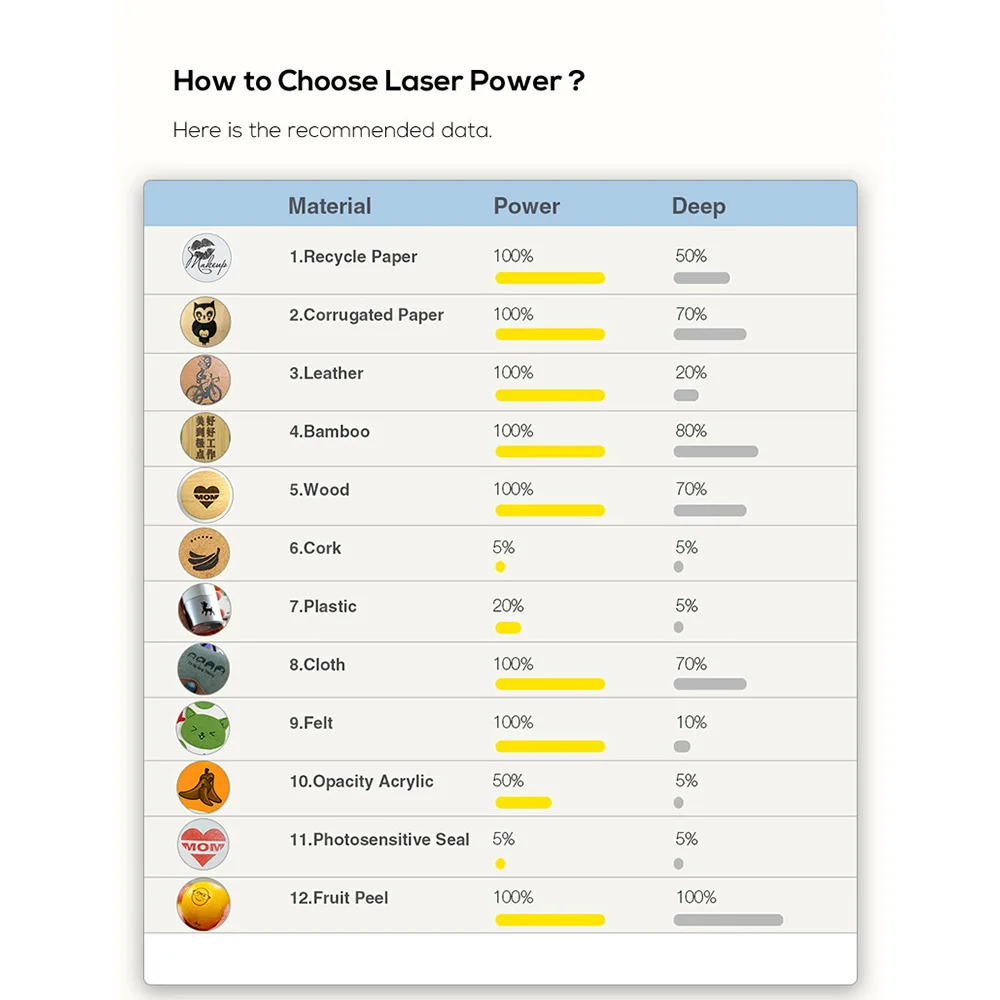 Перед покупкой: 1. Как установить параметры гравировки различных материалов! -Лазерное приложение woodpecker будет разумно рекомендовать параметры мощности гравировки и глубины различных материалов, и пользователь также может настроить Значение параметров регулировки; 2. На каких материалах я могу лепить? -- Лазерный дятел в незолотом картоне, пробке, ткани, войлоке, коже, дереве, пластике, Эва и т. Д. Могут быть вырезаны на мягких материалах; (белые, синие и высоко отражающие материалы должны быть окрашены черной белой доской Черный повторно вырезан) 3. Может ли он быть вырезан на одежде? -- Лазерный дятел может лепить на ткани одежды, но есть отражения на белом, зеленом и желтом Например, Лазерная мощность повреждена во время гравировки, поэтому рекомендуется использовать более высокую лазерную мощность, чтобы компенсировать работу, вызванную отражением. Скорость для достижения желаемого эффекта. 4. Можно ли выгравировать стекло, керамику и Лакированный металл? Керамические и стеклянные материалы должны быть теплоизоляционным слоем на поверхности перед гравировкой 5. Может ли быть вырезана нержавеющая сталь и камень? -Нет 6. Могу ли я выгравировать qr-код? -- Да, но разрешение рисунка, требуемое двумерным кодом, высокое, поэтому необходимо выбрать резку с высоким разрешением Материал узора, такой как плоская крафт-бумага, Темные деревянные доски и т. Д. 7. Как сделать прозрачный и белый? -Перед гравировкой необходимо почернить белой доской, чтобы предотвратить повреждение лазерной мощности, вызванное передачей на светильник; 8. Какова Самая глубокая глубина резьбы по дереву и пластику? -Лазерное приложение woodpecker будет разумно рекомендовать параметры мощности гравировки и глубины различных материалов, пользователи также могут настроить Отрегулируйте параметры. Указанные здесь деревянные и пластиковые системы имеют рекомендуемые значения. 9. Какие материалы могут быть вырезаны? -Такие как тонкие деревянные доски, картон, войлочная ткань и т. Д. 10. Как большой узор может быть вырезан на поверхности, может ли он быть вырезан по кругу? -- Это как-то связано с радианом поверхности, например, диаметр фруктового грейпфрута нормального размера может быть вырезан нормально Это модель 80 мм, и она обычно имеет диаметр 40 мм на более крупных оранжевых фруктах s. Узор; Если вы хотите вырезать круг, вам нужно подготовить подходящий Рисунок и сгруппировать его в разных положениях на материале несколько раз. Резьба по дереву. 10. Могу ли я доставить его в самолет? -Внутри нет аккумулятора, требуется внешняя стабильная мощность USB 5 В/2 А или более, также может использоваться Мобильная мощность Мощность, может быть проверена или взята с самолета.