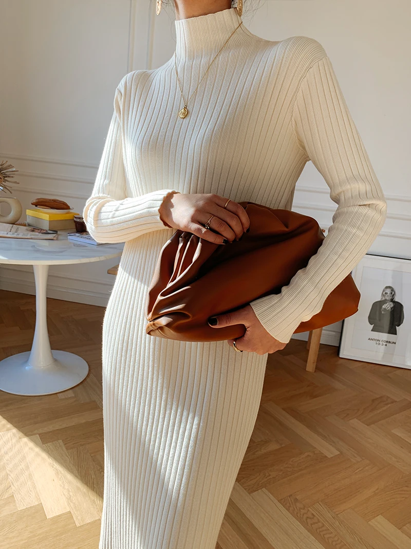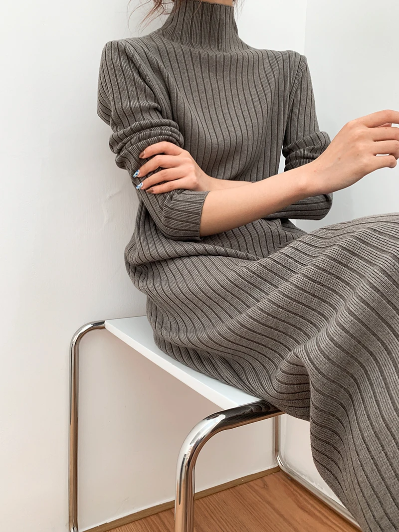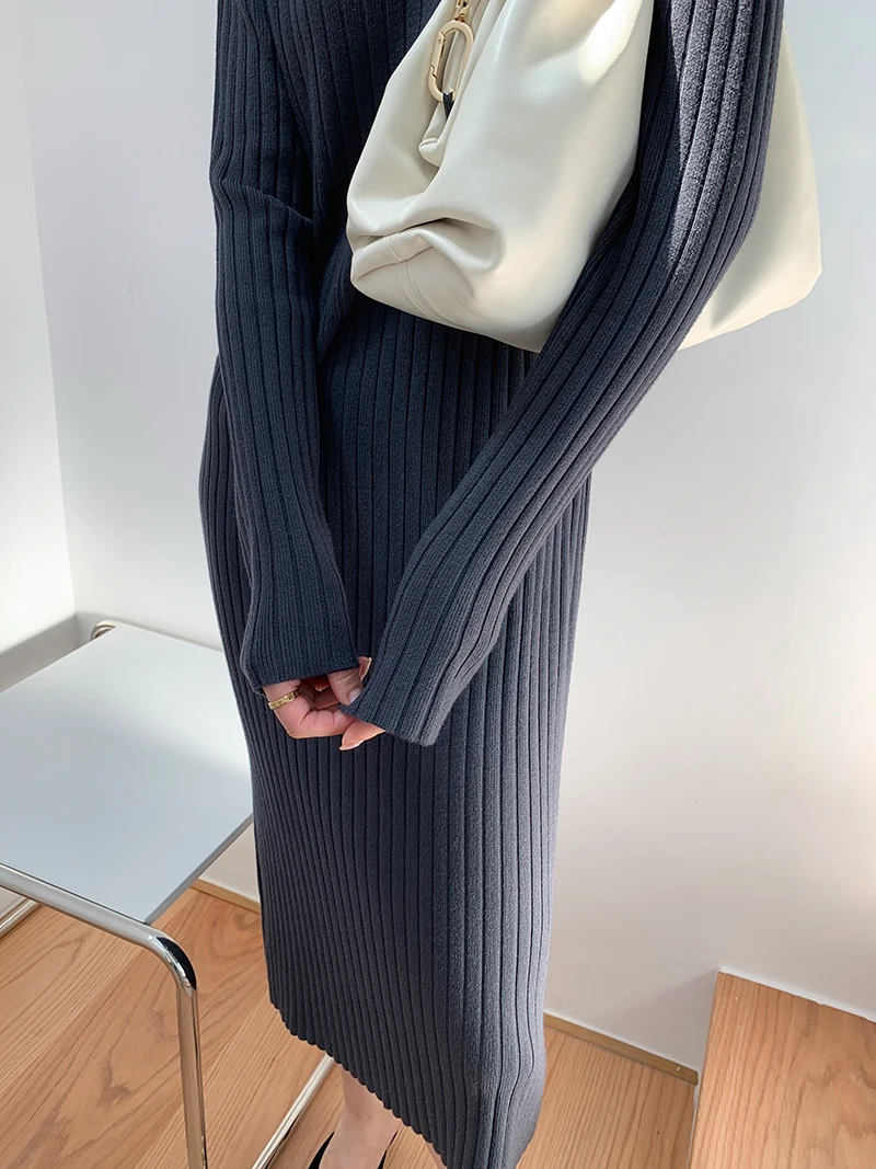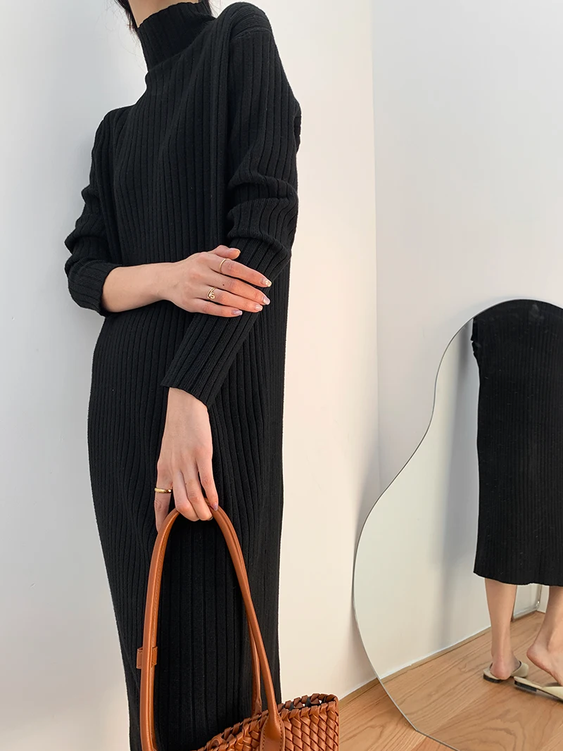 Корейский теплый однотонный плотный женский свитер с высоким воротником осень 2021 вязаные зимние платья-джемперы Новинка белое платье-свитер женское черное