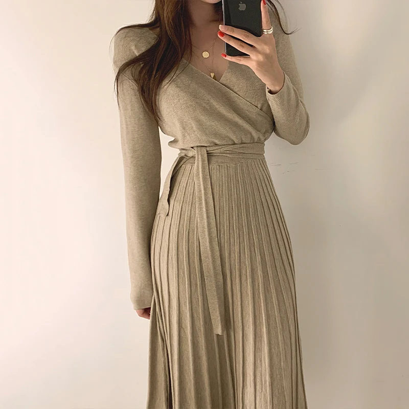 Зимнее плотное женское платье-свитер с поясом, новое Плиссированное вязаное Теплое повседневное однотонное платье-джемпер в Корейском стиле на осень 2021