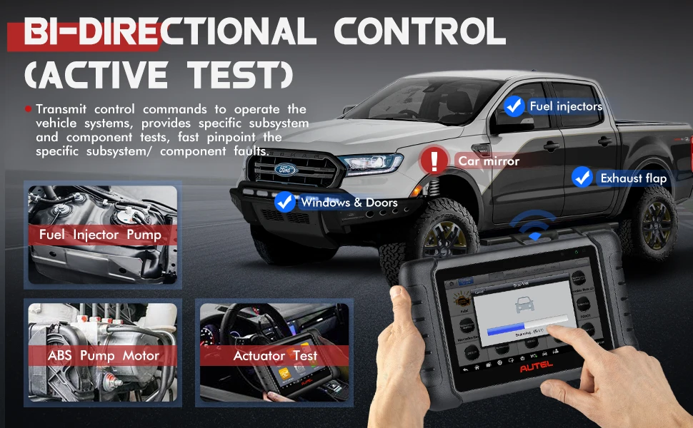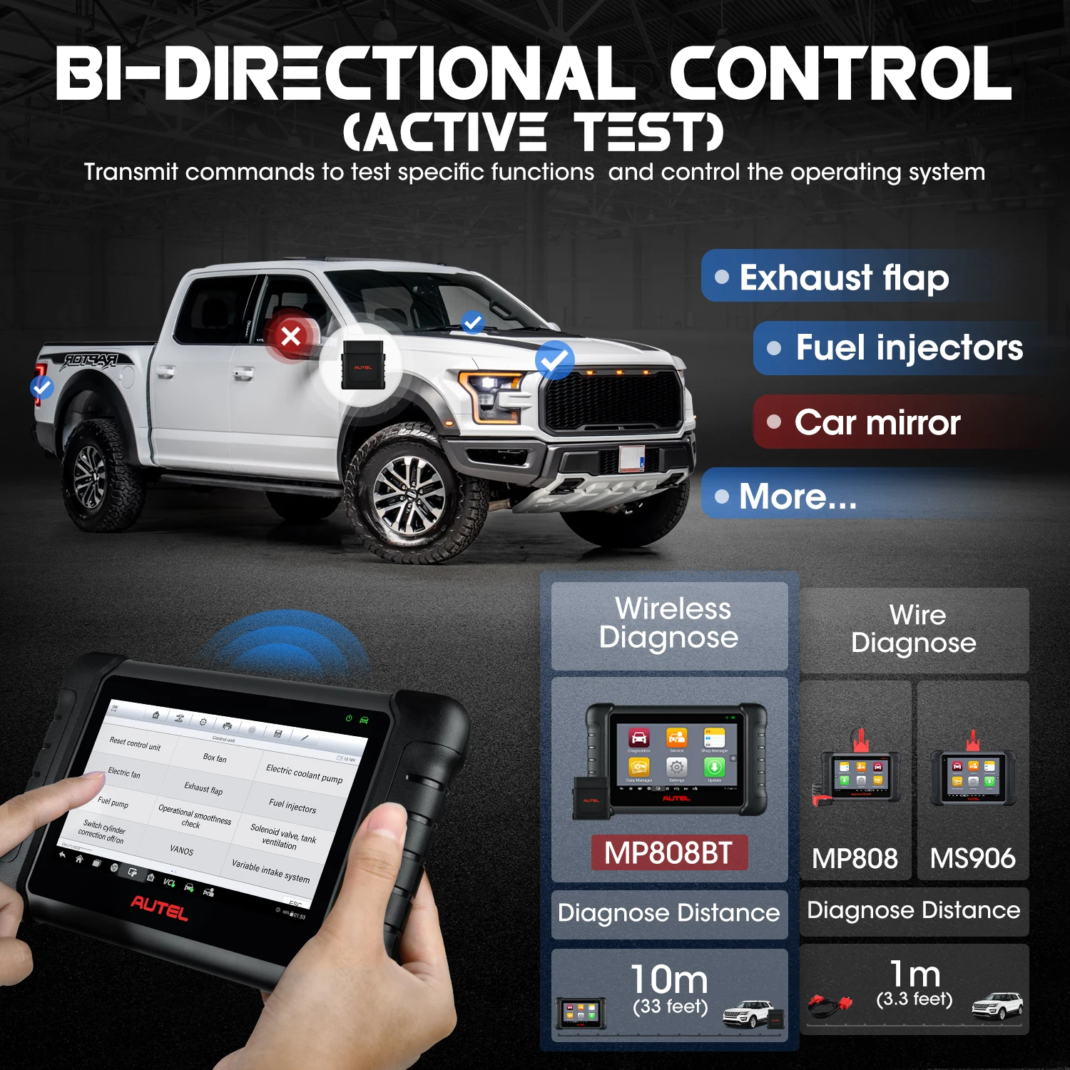 Autel MP808BT-это обновленная версия Autel MK808BT/MK808/MX808, поскольку эти модели не могут выполнять двунаправленную функцию.Двунаправленный сканер MaxiPro MP808BT, который может управлять различными деталями или компонентами автомобиля для проведения активных тестов (также известных как испытания компонентов, функциональные тесты), например, включение/выключение топливного насоса, включение/выключение муфты кондиционера, тест EVAP, Проверка отдельных топливных форсунок, окон, дверей, Люка, дворников, Контролировать операции, чтобы проверить, правильно ли они функционируют и быстро определить причины неисправности.