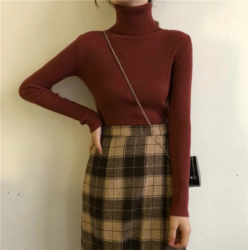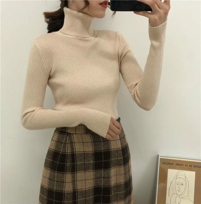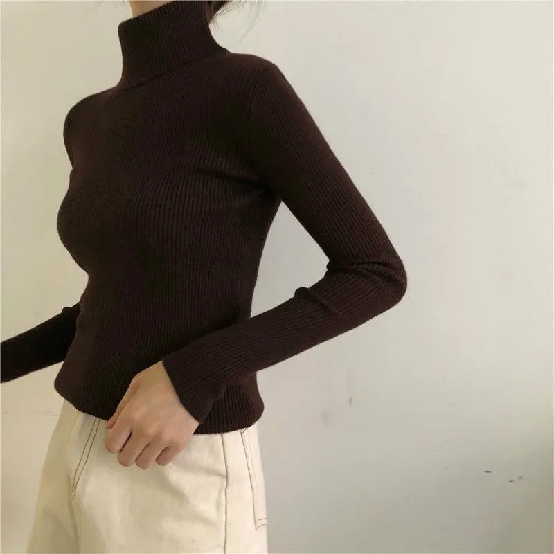 Новинка 2021, Женский вязаный свитер с высоким воротником, модный топ с высоким воротником, облегающая женская вязаная Базовая рубашка, простой женский свитер