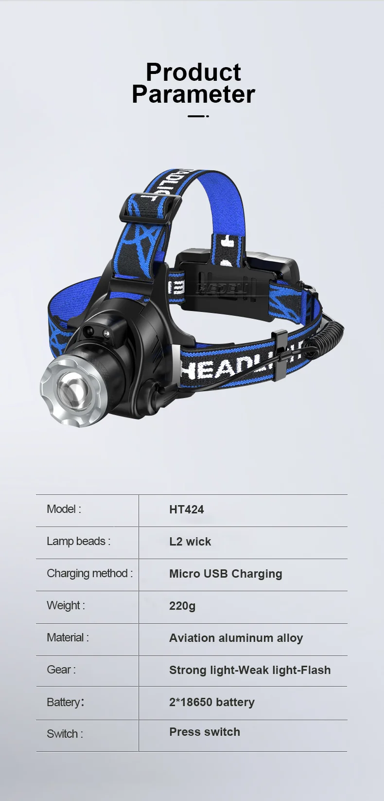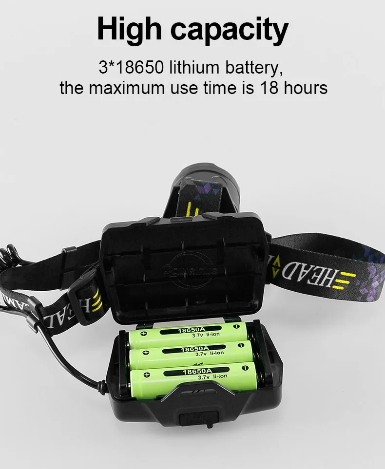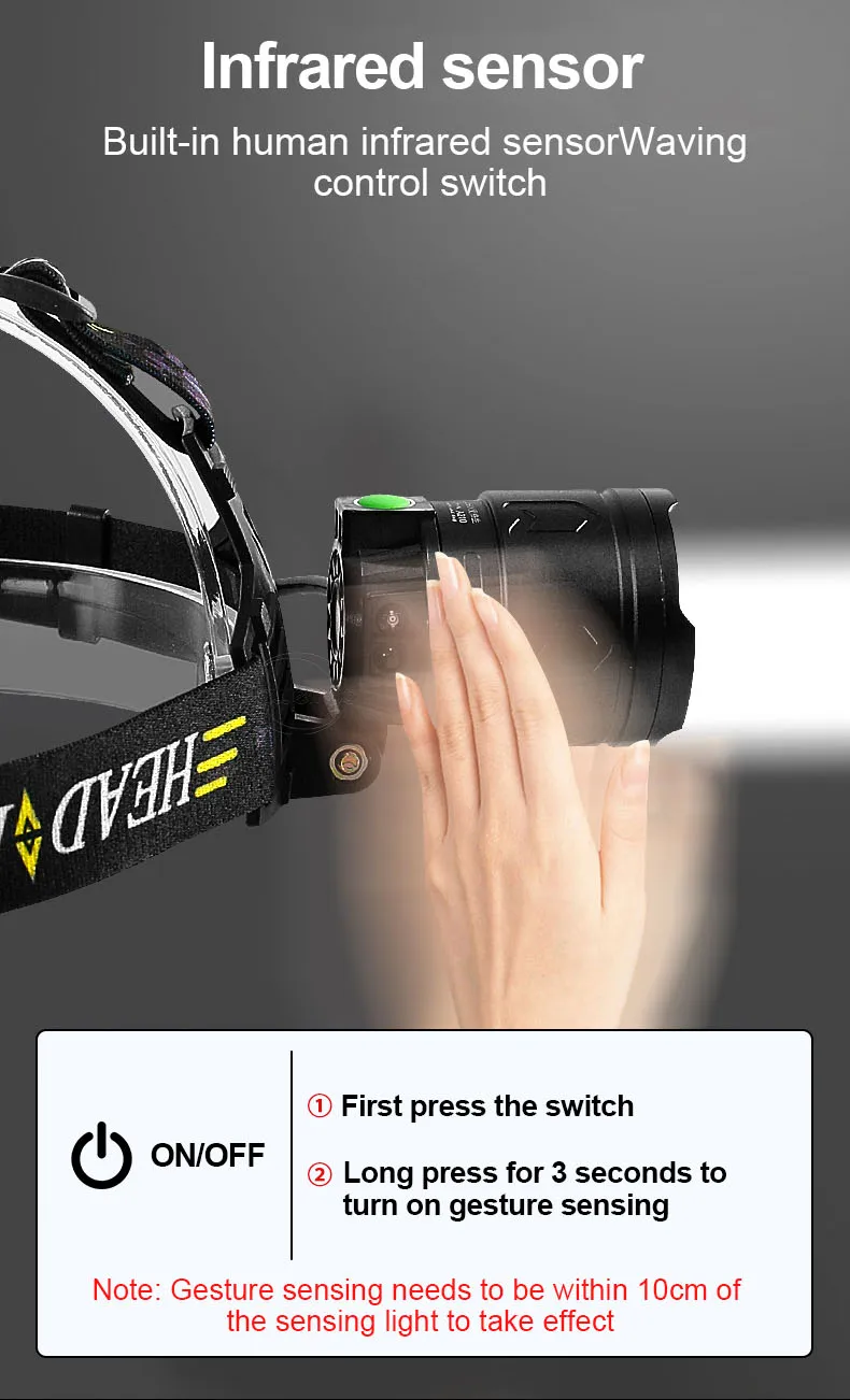 Описание товара→ Тип фитиля: XHP190 фитиль→ Материал: алюминиевый сплав→ Конфигурация батареи: 3*18650 батареи→ Выносливость: 10-18 часов→ Водонепроницаемость: IPX6→ Расстояние облучения: 800-1500 м→ Тип переключателя: нажимной→ Режим переключения: сильный светильник-средний Светильник-низкий светильник-вспышка-SOS→ Интеллектуальное восприятие: Длительное нажатие в течение 3 секунд, чтобы включить распознавание жестов→ Примечание: Датчик жестов должен быть в пределах 10 см от чувствительного светильник→ Способ зарядки: микро USB зарядка→ Цвет корпуса: черный→Indicator светильник: 4-сегментный индикатор заряда батареи светильник, красная сигнальная лампа светильник на задней панели→ Назначение: многофункциональная фара для кемпинга, работы, охоты, безопасности, разведки, рыбалки, поиска и спасения→ Головная повязка может растягиваться и регулироваться в соответствии с размером головы, что удобно надевать или снимать и более удобно использовать