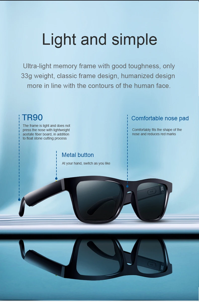 Умные солнцезащитные очки E10-отличный компаньон для вашей повседневной жизни. Это идеальное сочетание BT музыки и УФ-защиты солнцезащитных очков. Вы будете иметь четкое видение независимо от того, какая ситуация. Более того, вы можете наслаждаться свободой беспроводной музыки и громкой связи. Подходит для активного отдыха, таких как Велоспорт, рыбалка, путешествия, альпинизм, гольф и т. д.