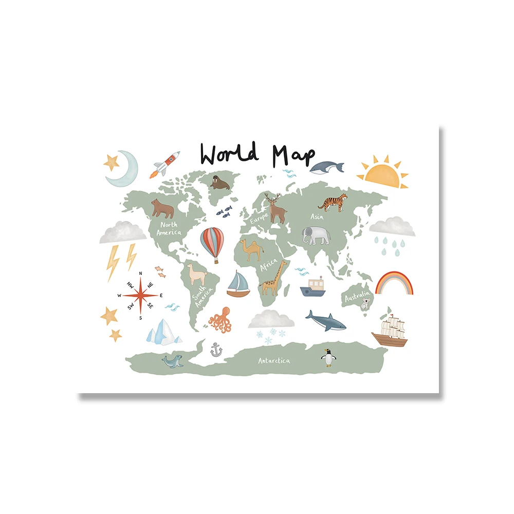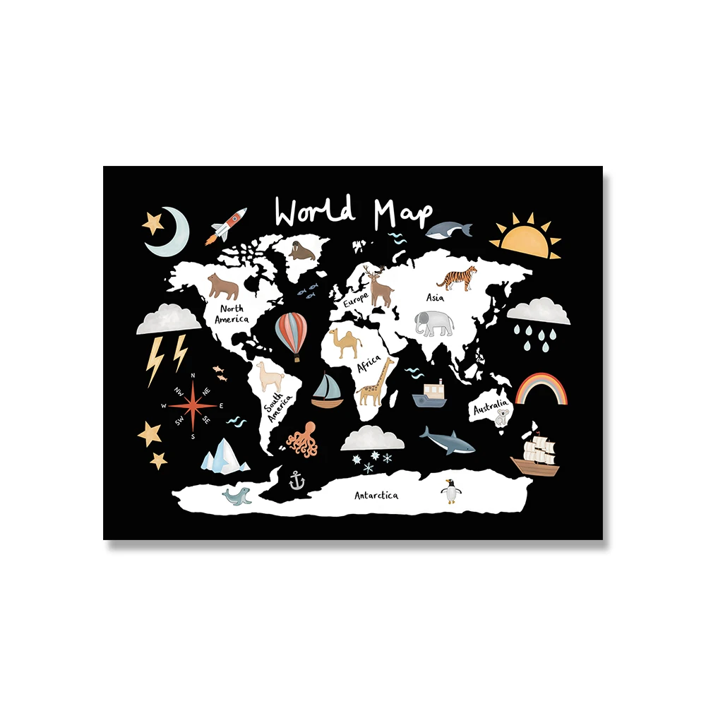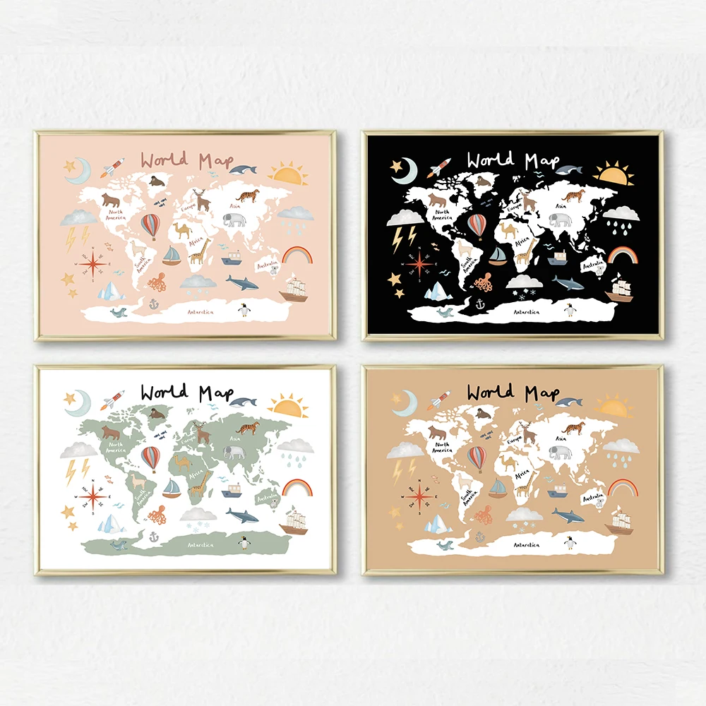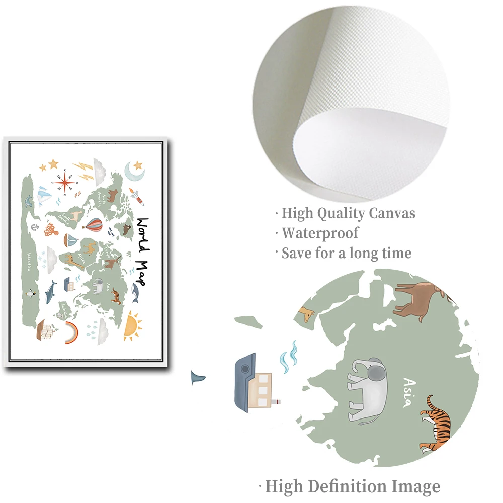 Детская карта мира с дикой природой, Картина на холсте, красочная д...