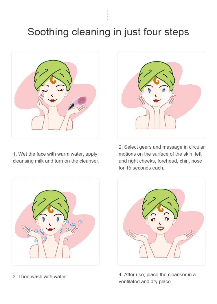 1. Намочите лицо теплой водой. Нанесите моющее средство. Включите звуковую чистящую щетку.2. Выберите правильный уровень вибрации для вашего типа кожи. Массируйте круговыми движениями по щекам, лбу, подбородку и носу в течение 15 секунд.3. Краску с теплой водой. 4. Краску Очищающую щетку оставьте в хорошо проветриваемом помещении, чтобы высохнуть.
