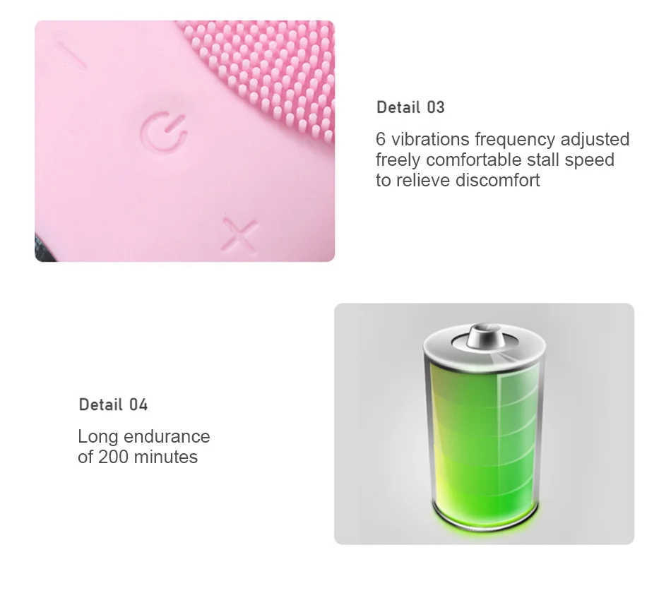 Еда из пищевого силикона и АБС-пластика, безопасны для ухода за кожей: данное устройство легко содержать в чистоте Для гигиеническая очищающие средства испытываем каждый time.200mAh заряда аккумулятора хватает на 200 минут на одной всего за 2 часа Зарядка: если вы используете это устройство в течение 4 минут в день, вы можете перейти за 7 недель до перезарядки.