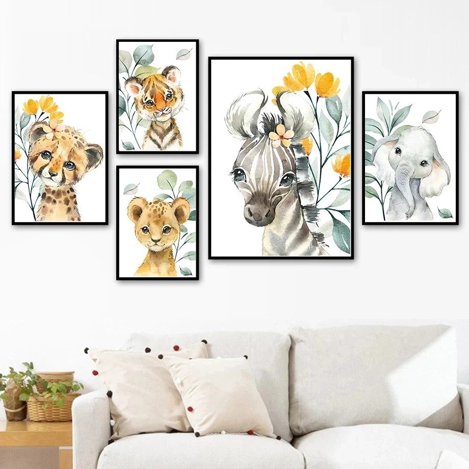 Настенный постер для детской комнаты с рисунком животных, Картина на холсте тигр, Лев, слон, жираф, цветы, фотография стены детской спальни