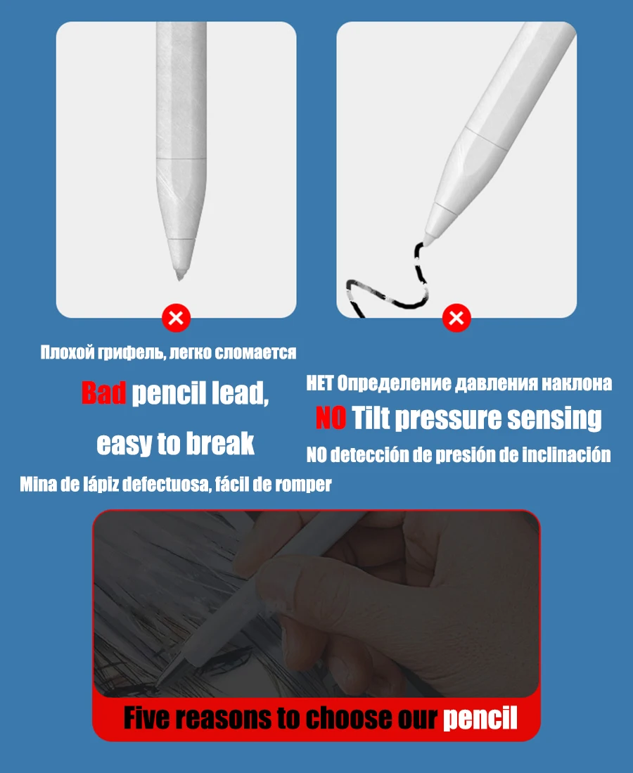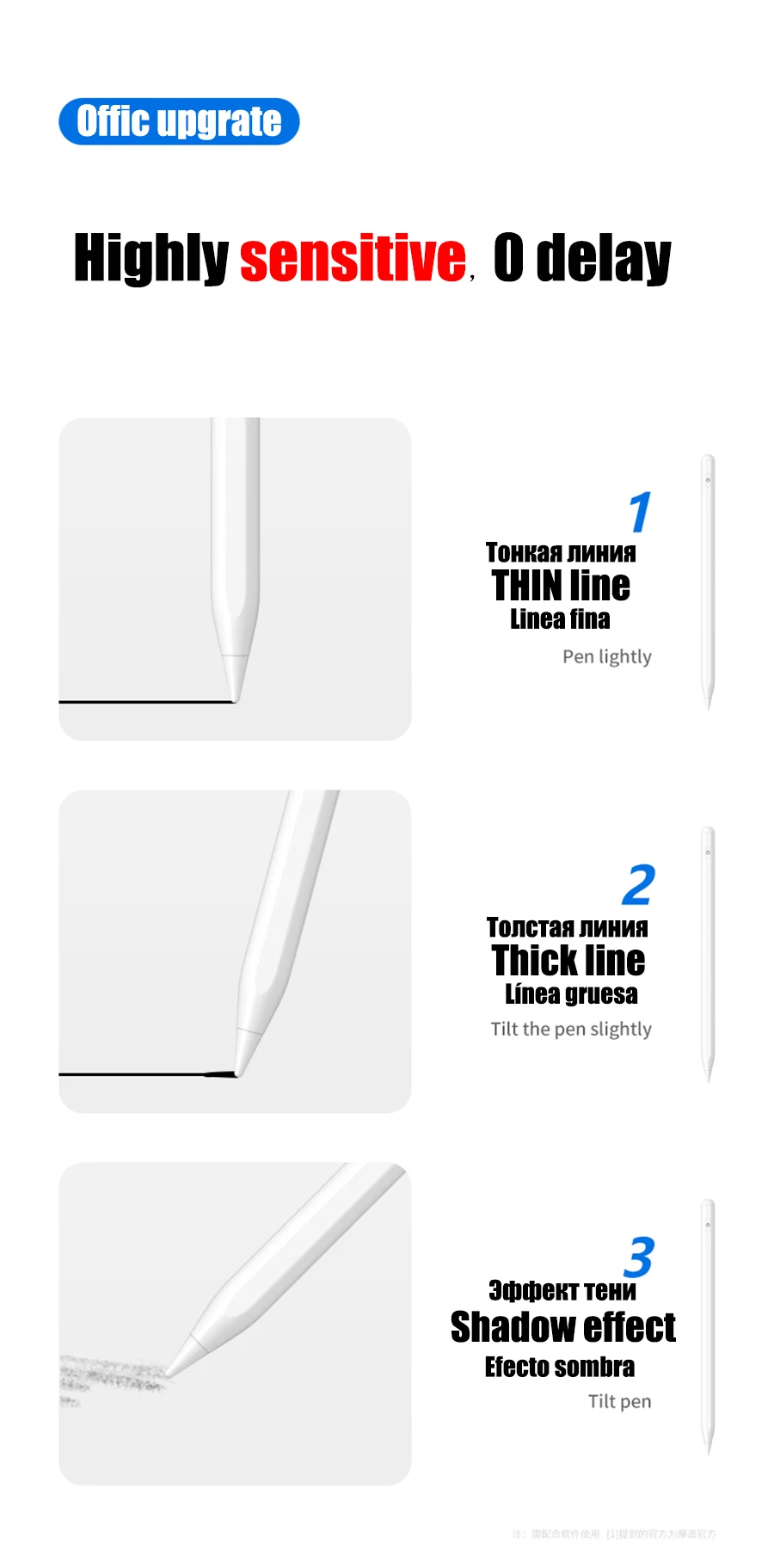 Es un buen producto, funciona muy bien y el diseño está bastante bueno. Sin embargo, es falso que tenga diferentes espesores al inclinar el lápiz. Incluye un cable de carga y 2 puntas de cambio, el rechazo de palma funciona a medias con algunas apps, pero nada del otro mundo.