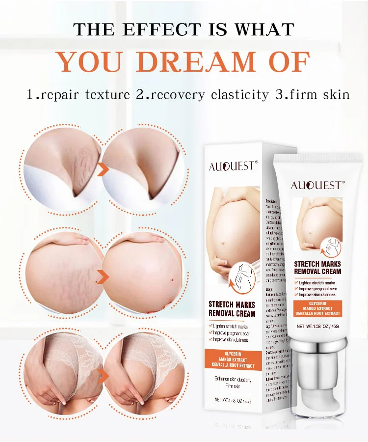 Ваша жизнь не должна быть нарушена растяжками после рождения ребенка. Наш крем для Удаления растяжек изготовлен из нескольких натуральных ингредиентов, включая глицерин, экстракт mangifera indica, экстракт корня центеллы и так далее. Он может эффективно и мягко осветлить растяжки и улучшить шрам для беременных. Верните свой гладкий и нежный живот, верните свою счастливую жизнь.