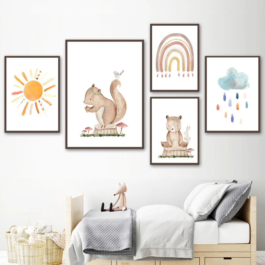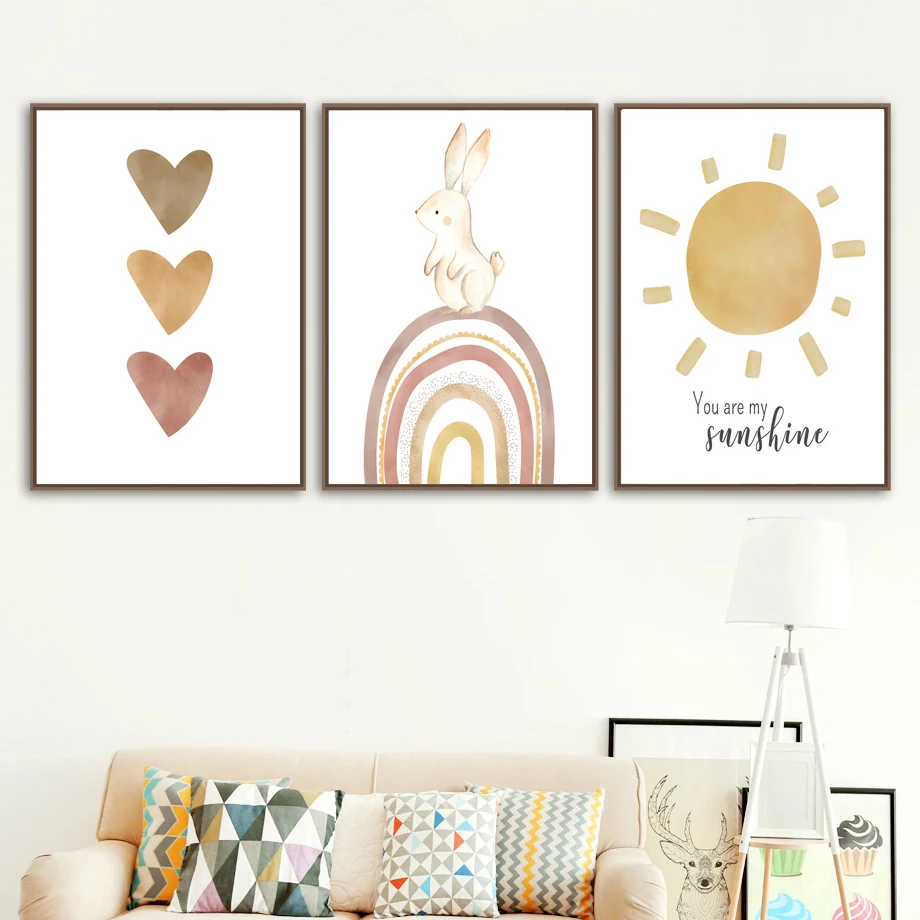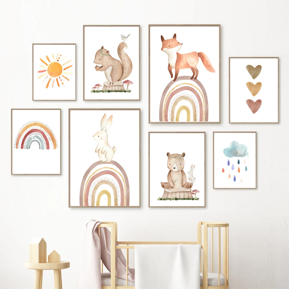 Картина на холсте в стиле бохо, сердце, Радужные облака, солнце, лиса, кролик, медведь, скандинавские постеры и принты, декор, фотографии, детская комната