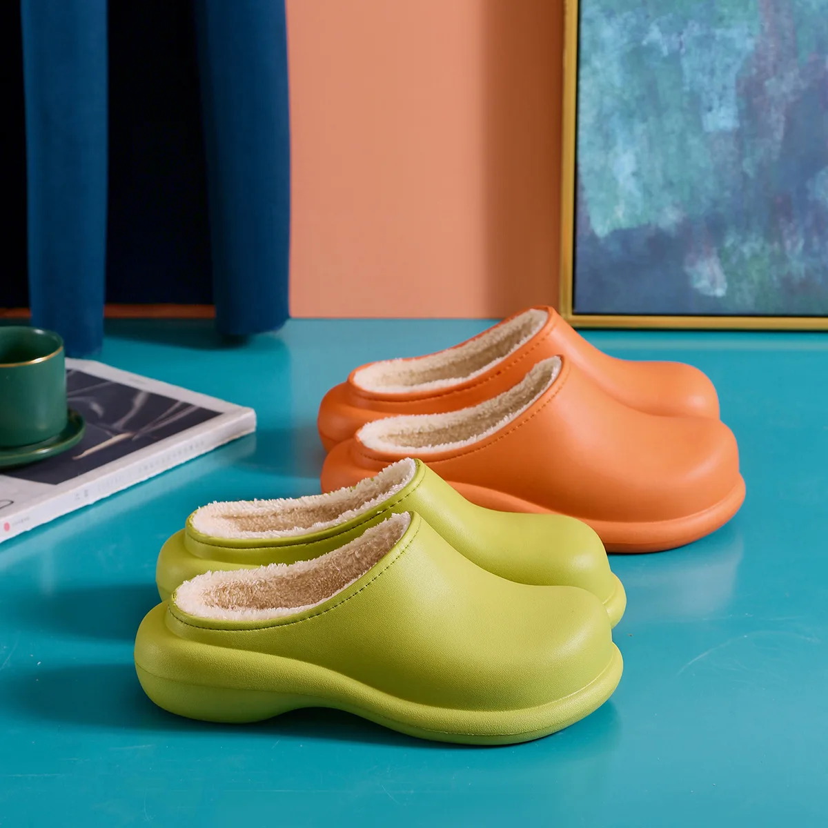 Обувь для женщин; Коллекция 2021 года; Зимние теплые пушистые домашние тапочки; Женская обувь на платформе из хлопка; Цвет Зеленый, кроксе; Мягкая Водонепроницаемая меховая обувь на плоской подошве