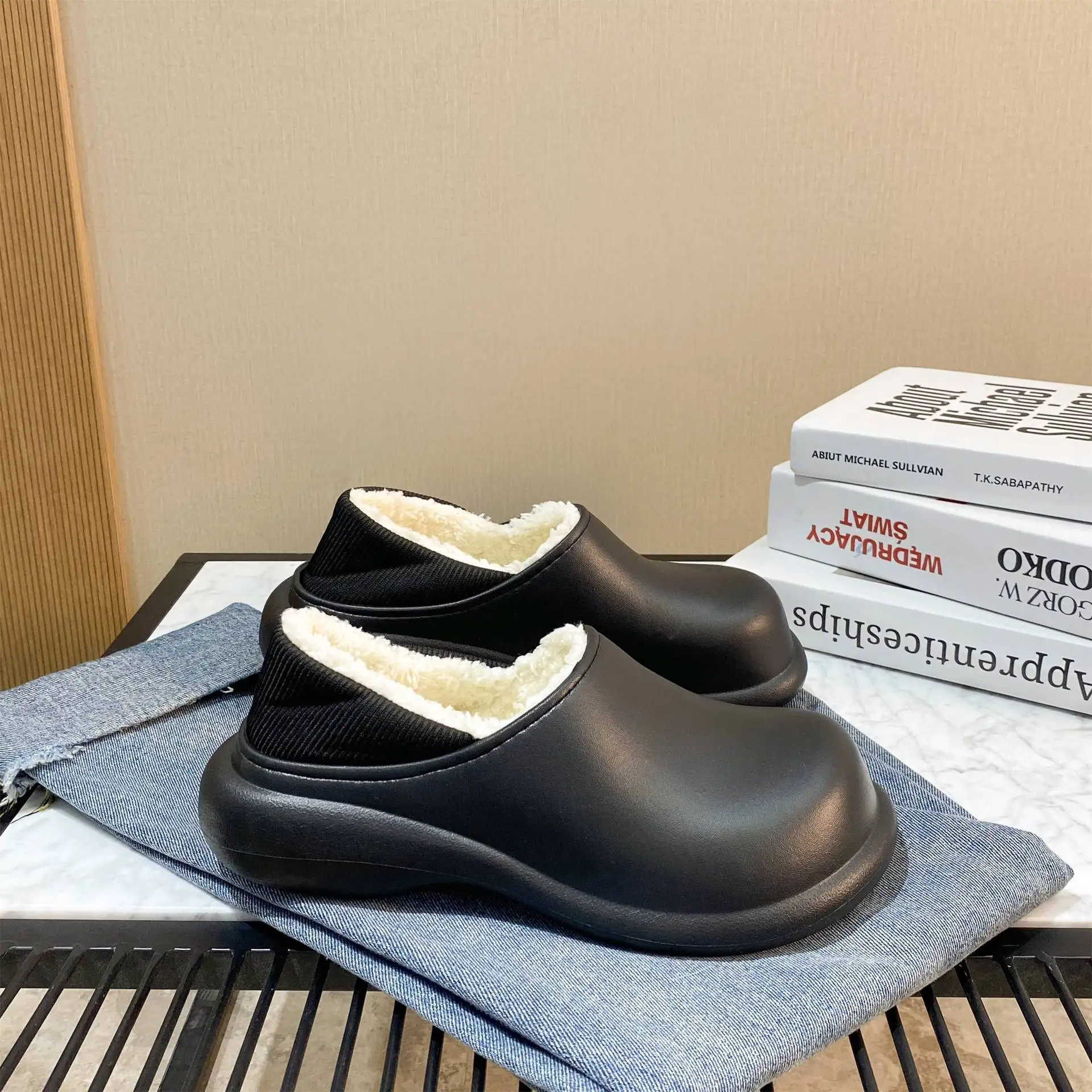 Сабо женские, зимние, черные, на танкетке, садовые туфли, меховые, ...