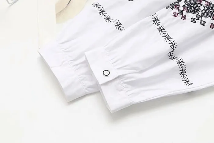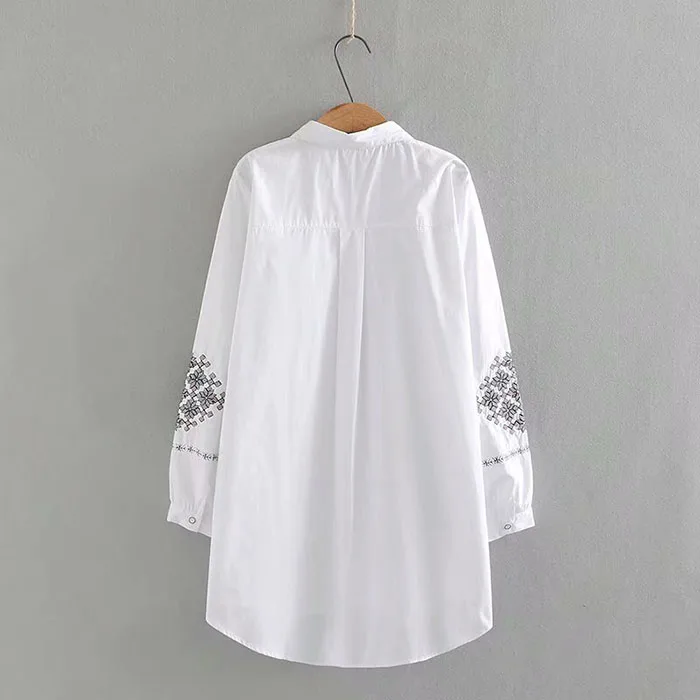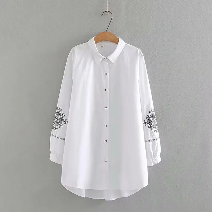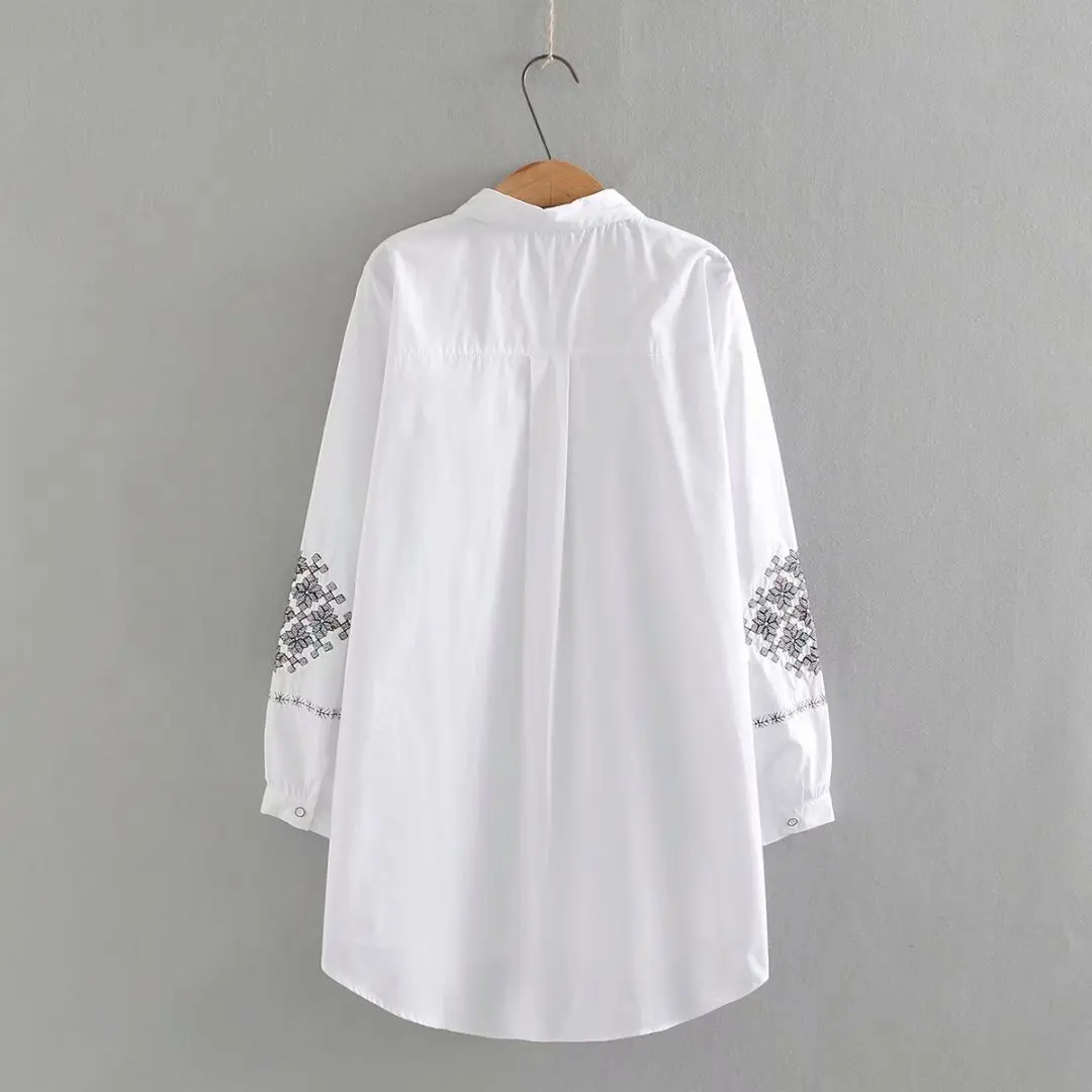 Женская свободная рубашка с отложным воротником, белая блузка большого размера с длинным рукавом и вышивкой, весна-осень 2021
