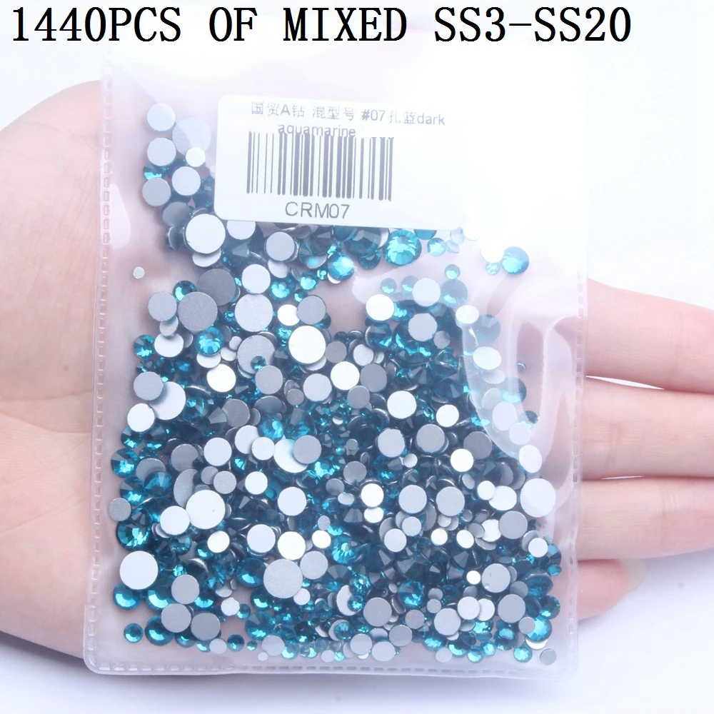 Темный Аквамарин без горячей фиксации стеклянные стразы SS3-SS34 и смешанные размеры клей на страз камни и кристаллы украшения для ногтей принадлежности
