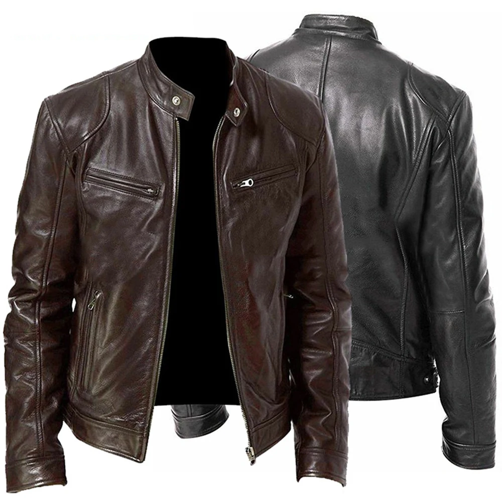 Мужская винтажная кожаная куртка из ПУ кожи, с воротником-стойкой