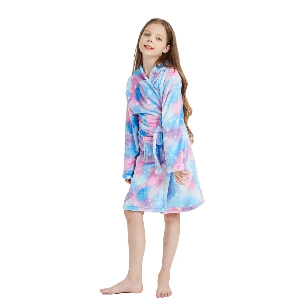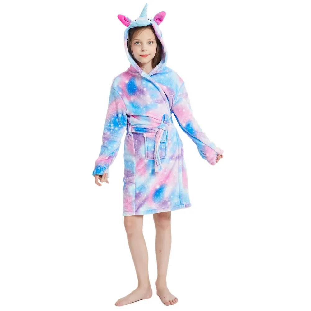 Новые Модные фиолетовые и розовые банные халаты для детей ночные рубашки для девочек с единорогом фланелевые теплые аксессуары для детской одежды