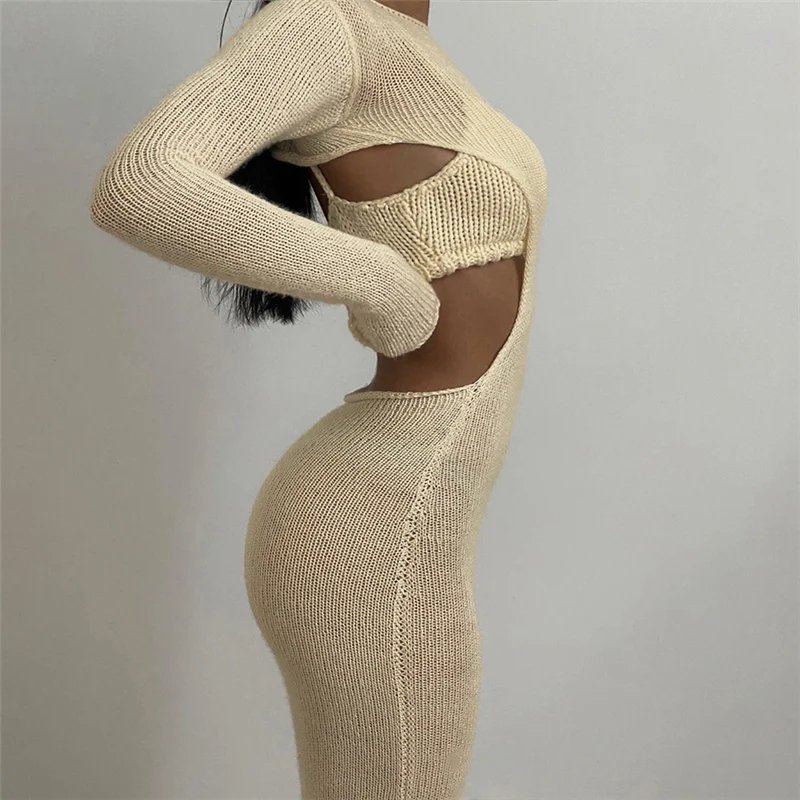 Женское трикотажное платье-миди с длинным рукавом и открытой спиной
