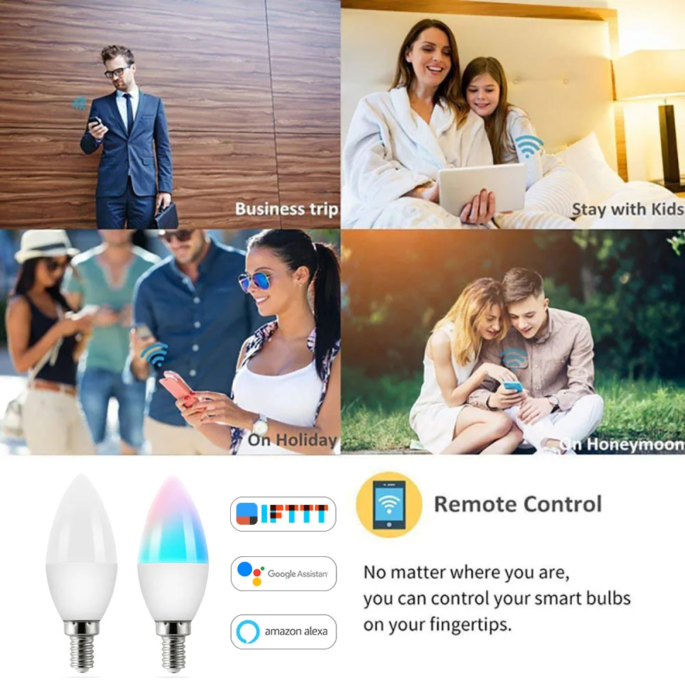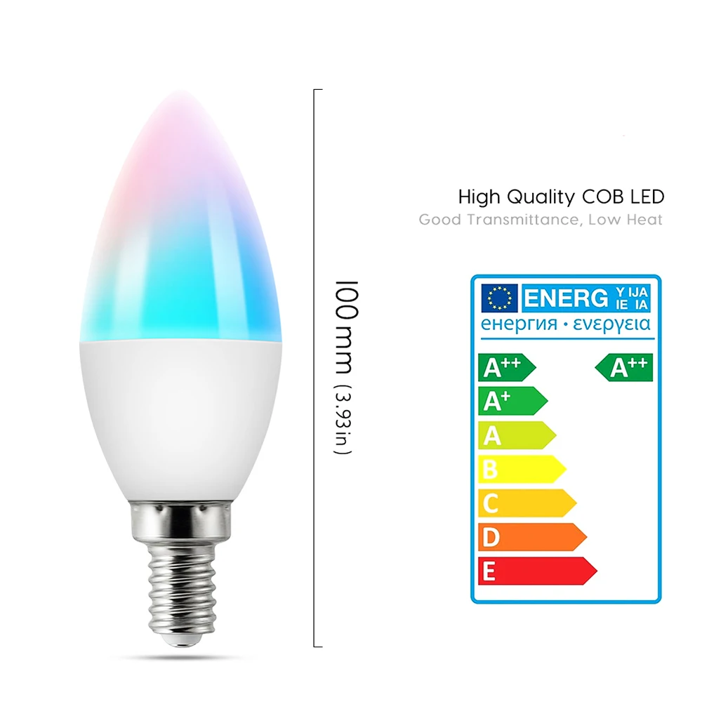 Основание: E14Беспроводной Тип: Wi-Fi 2,4 ГГцНоминальная мощность: 3,5 WНапряжение: AC100-240V 50/60HzЦвет: RGB + CCT 3000-6000KРегулировка яркости: ДаПоддерживаемая система: IOS/AndroidСветовой поток: 400 лмУгол луча: 120 °