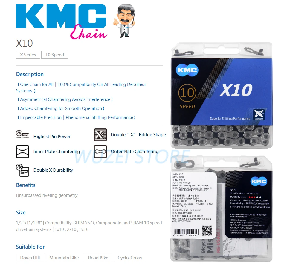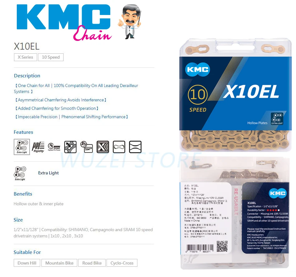Цепь для горного велосипеда KMC, 10 скоростей, X10, X10EPT, X10EL, X10SL, золотистаясеребристая, 116 звеньев