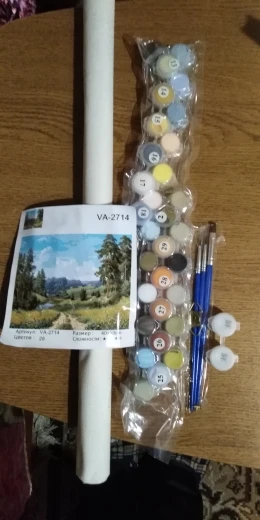 Заказ был отправлен через 1 день после оплаты, доставлен в "Пятерочку" за 3 дня. В комплекте все в наличии: холст, краски, бумажная схема, изображение картины, кисти. Прекрасно упакован, очень рекомендую.
