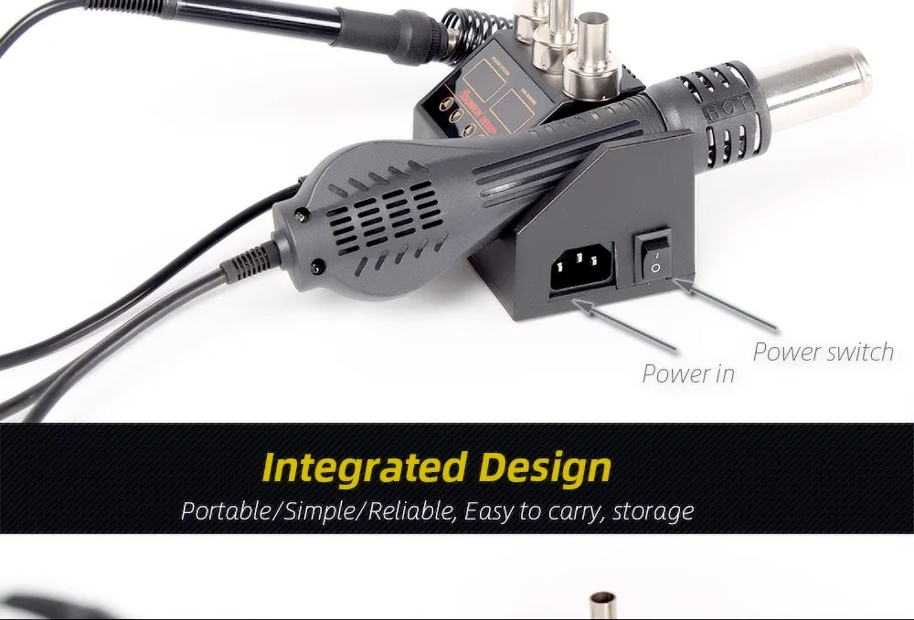 · Паяльная станция 2-в-1 с горячим воздухом и горячим утюгом;· Чрезвычайно низкий уровень шума и компактный дизайн;· Двойные ЖК-цифровые дисплеи для отображения точной температуры;· Микрокомпьютерное управление SAMSUNG, быстрый прогрев;· Технология PID для повышения стабильности температуры;· Легко регулировать поток воздуха и контроль температуры вращения;· Функция самообнаружения ntelligence обеспечивает безопасную личную эксплуатацию;· Автоматически останавливает вращение при температуре менее 70'C;· Ручка с сенсорным переключателем имеет доступ к режиму работы при поднятии или в режиме ожидания, когда ложится;· Функция автоматического охлаждения для эффективного продления срока службы нагревателя и защиты фена;· ESD конструкция паяльника для защиты чувствительных компонентов;· Обогреватель международного стандарта для удобного использования и обмена;· Высокое качество сопротивления для длительного использования;· Пластиковый держатель для установки термофена;· Металлическая подставка для защиты утюга от легковоспламеняющихся материалов;· Подходит для термоусадки, сушки, удаления лака, удаления вязкости, выледенения, предварительного нагрева и пайки клеем;