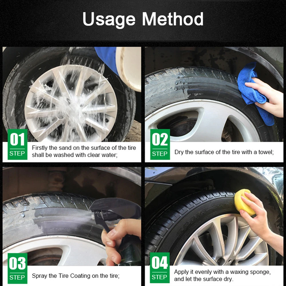 1. Блестящие черные шины могут улучшить внешний вид колеса.2. Черный блеск появляется в течение нескольких секунд.3. Дайте вашим шинам новый вид.4. Экологически чистый, без растворителя или нефти. Так что это не повредит ваши шины.5. Этот продукт подходит для всех цветов. Использование микромолекулярного покрытия может восстановить яркость шины и поддерживать яркость в течение длительного времени. Просто распылите количество нанесения на шину, а затем протрите полотенцем.