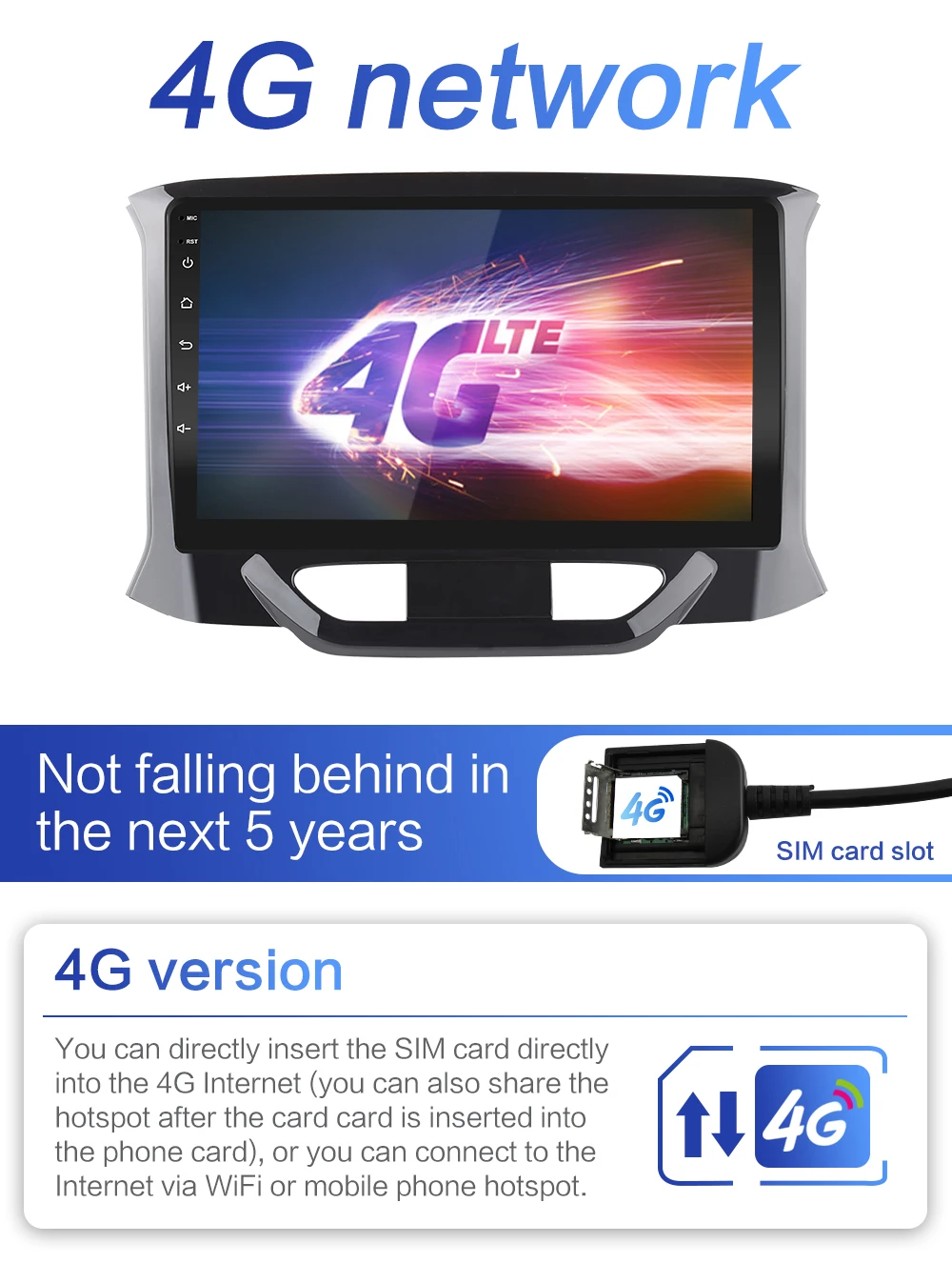 Версия 4GВы можете подключить sim-карту непосредственно в интернет 4G (вы также можете поделиться точкой доступа после вставки карты в карту телефона), или вы можете подключиться к интернету через Wi-Fi или мобильную точку доступа.Версия WiFiВы можете подключаться только к Интернету через WiFi или мобильные точки доступа.(Пожалуйста, будьте осторожны, чтобы не покупать ошибки,Не понимаю, можете связаться со службой поддержки клиентов)