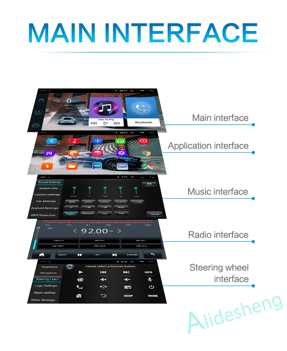 Вы можете выбрать пользовательский, Стандартный, рок, мягкий, классический, поп, зал, джаз, кино, его поддержку для регулировки SUBW,LOW,MID, высокий, и вы можете установить звук на драйвер, переднее, заднее все положение