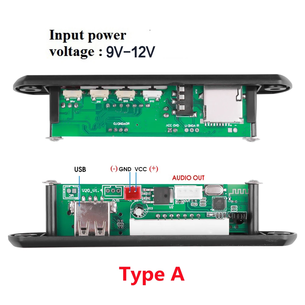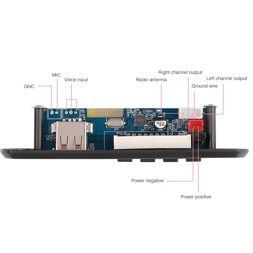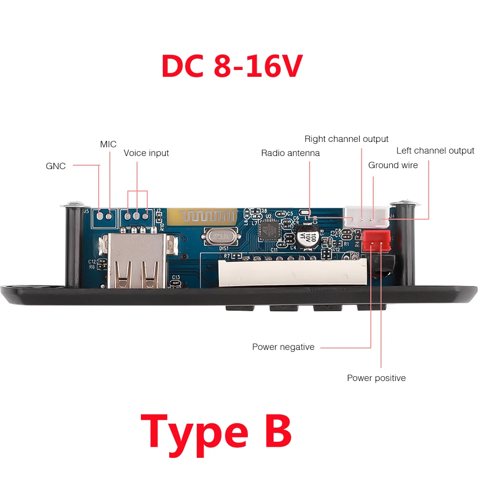 Технические характеристикиМодель: M15B Bluetooth версии 5,0. Поддержка формат музыки без потери качества воспроизведения с мощным функция защиты от перегрузки (защита от обратного подключения не сгорает материнская плата и на дисплее появится не светильник)Инфракрасный Прием: может совпадать с инфракрасным пультом дистанционного управленияTF: слот для карт, подключенный к tf-карте памяти (максимальная поддержка 32 Гб);Экран: цифровой цветной экран, красный (возможно изготовление на заказ цветного экрана);AUX: аудио входной интерфейсИнтерфейс USB: подключение к u-диску (максимальная поддержка 32 Гб);VOL-: Короткое нажатие на предыдущую песню в режиме USB/SD; Короткое нажатие на предыдущую станцию в fm-режиме и длительное нажатие на громкость для уменьшения.Сканирование: короткое нажатие для воспроизведения/паузы в состоянии USB/SD, длительное нажатие для автоматического сканирования радиостанций в FM состоянии;VOL +: Короткое нажатие на песню в режиме USB/SD; Короткое нажатие на радиостанцию в FM состоянии и Длительное нажатие на громкость для увеличения;Режим: когда есть sd-карта и u-диск: последовательность переключения-usb→ sd→ fm→ aux→ usb; Когда есть только u-диск: последовательность переключения-usb→ fm→ aux→ usb; Когда есть только sd-карта: последовательность переключения sd→ fm → aux→ SD;IC Главного управления: AB5362BBluetooth IC: AB5362B версия Bluetooth 5,0Формат музыки: MP3 / WMA / WAV и другие форматы без потерьРадио FM частота: 87,5-108,0 МГцПоддержка функции: поддержка MP3 / USB / TF / LINE IN / FM / BLUETOOTH/дистанционное управление/DC 5 В или 12 В (максимум 5 в не может превышать 5 В; максимум 12 В не может превышать 16 В, теория не превышает 24 В может быть настроена на выбор,)О конструкции: Размер панели: 106*25 мм, две стороны панели-это положение отверстия для винтов, ширина платы-19,8 мм, глубина платы составляет 24 мм