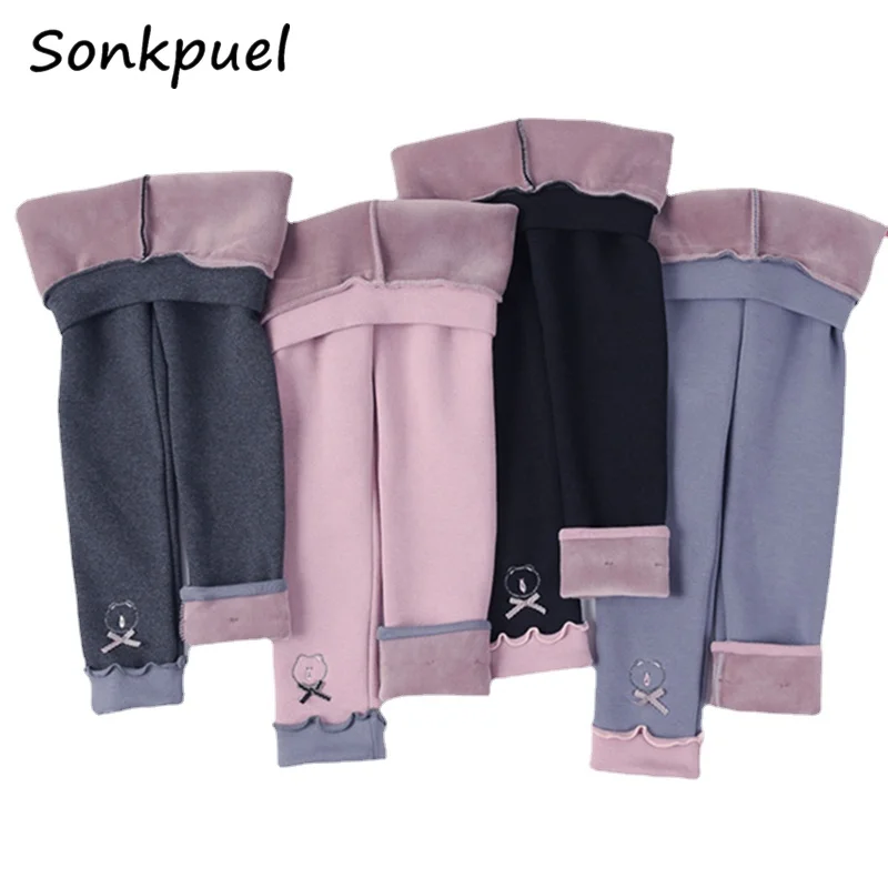 Зимние детские леггинсы для девочек, детские хлопковые плотные бархатные леггинсы в Корейском стиле с принтом медведя и бантом