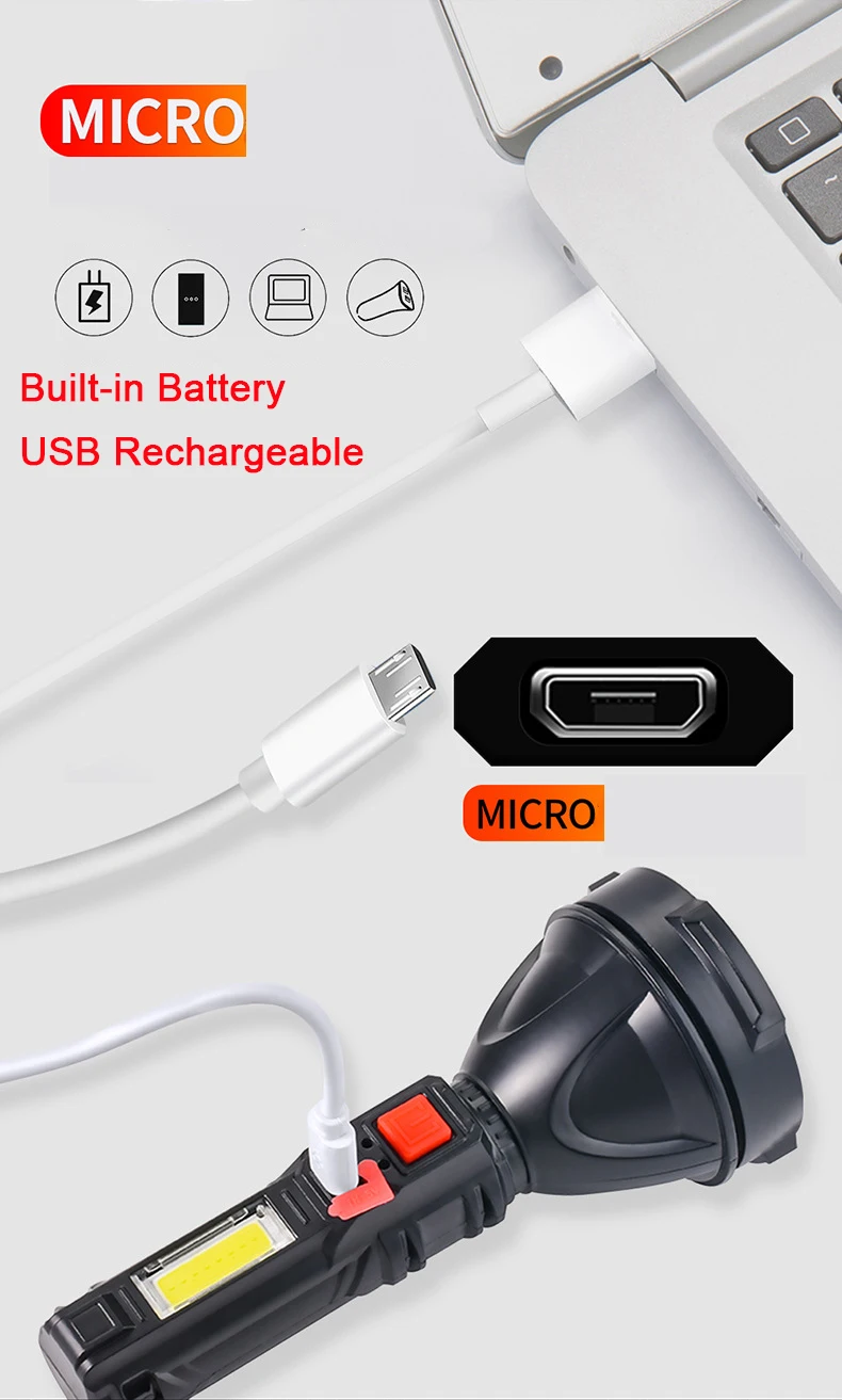 Портативный мощный светодиодный + COB боковой светильник, флэш-светильник фонарь большой дальности светильник встроенный аккумулятор USB Перезаряжаемый фонарь, водонепроницаемый