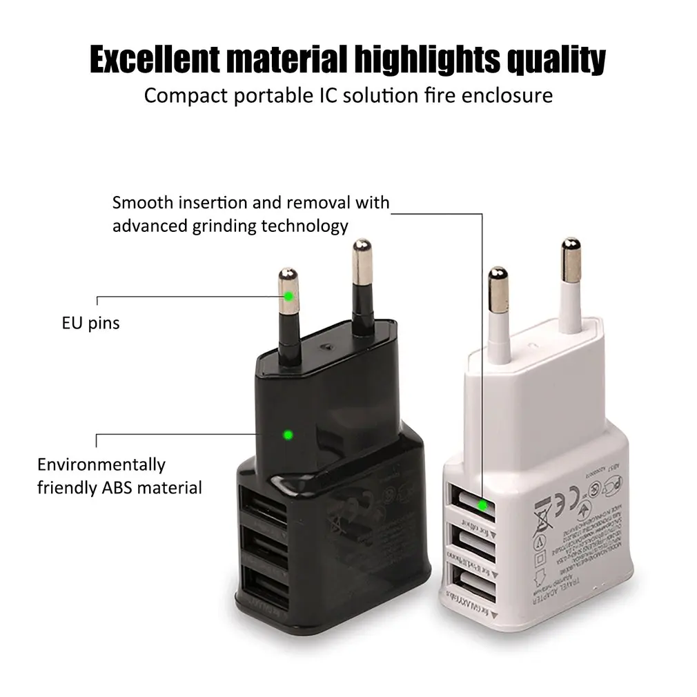 Особенности:Защита от перегрузки по току, защита от перегрева, защита от перегрева, защита от короткого замыкания.Портативный размер, подходит для дома, путешествий, бизнеса.Защита от перенапряжения, автоматическая защита от перегрузки, огнезащитная защита.Совместим с различными популярными мобильными телефонами, такими как apple, Samsung и т. д.Сертифицированный шнур питания и вилка, более длительный срок службы.1USB,2USB,3USB порт, умная зарядка, Встроенный смарт-чип.