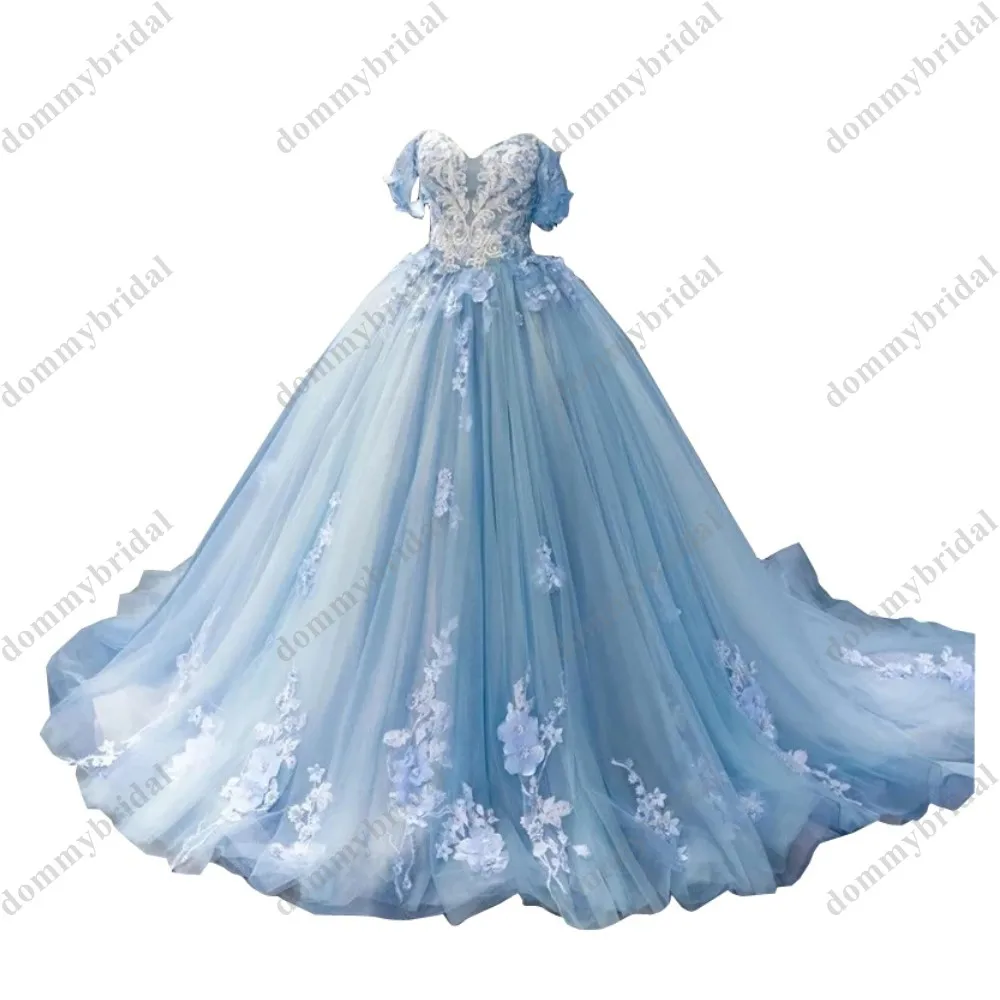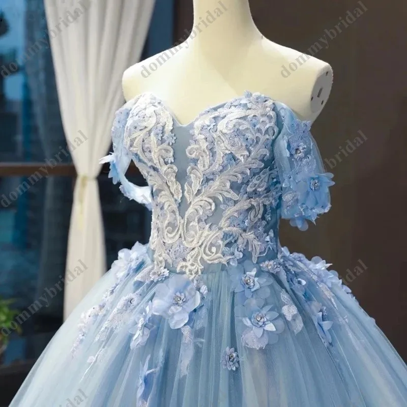 2022 Белое кружево светло-голубой тюль с открытыми плечами ТРАПЕЦИЕВИДНОЕ свадебное платье Принцесса с 3D цветочными фотографиями
