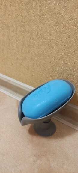 Очень удобная мыльница. Прилепили на край умывальника и все капли стекают в умывальник. Мыло всегда сухое и чисто вокруг.