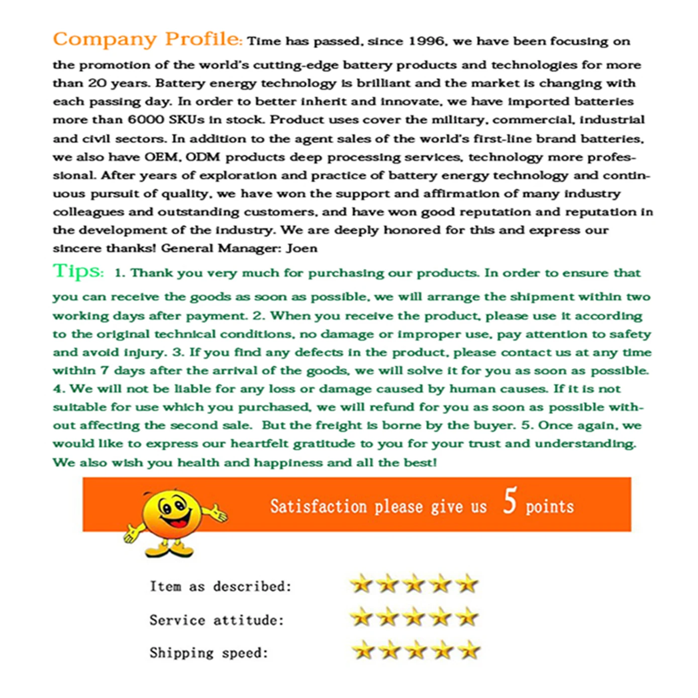 Профиль компании:Прошло время, с 1996 года Мы фокусируемся на продвижении новейших продуктов и технологий для аккумуляторов в мире уже более 20 лет.Технология энергии батареи является блестящей, и рынок меняется с каждым днем. Для того, чтобы лучше унаследовать и инновации, мы импортировали Аккумуляторы более 6000 SKUs в наличии. Использование продукта охватывает военный, коммерческий, промышленный и государственный секторы.В дополнение к агентным продажам аккумуляторов первого в мире бренда, мы также имеем OEM, ODM продукты глубокой обработки услуг, технологии более профессиональные.После многих лет исследований и практики технологии энергии батареи и непрерывного стремления к качеству, мы завоевали поддержку и подтверждение многих отраслевых коллег и выдающихся клиентов, И завоевали хорошую репутацию и репутацию в развитии отрасли.Для нас большая честь и мы искренне благодарим вас!Главный менеджер: Joen