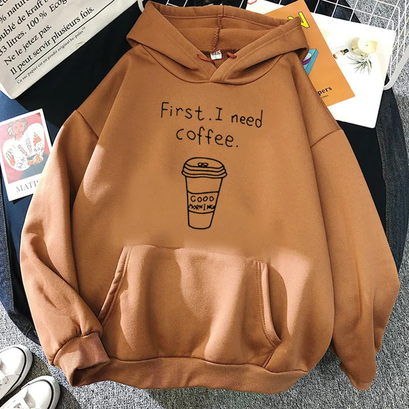 Осенне-зимние женские толстовки в стиле Харадзюку, свитшот с надписью First I Need Coffee, водолазка с длинным рукавом, флисовый пуловер для девочек