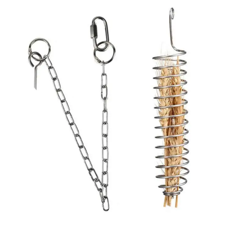 Использование: сначала Положите уши проса, Длинные фрукты (например, яблочные палочки, оранжевые лепестки и т. д.) и овощи в корзину для еды, закройте замок безопасности сверху, А затем Повесьте их в птичьей клетке.