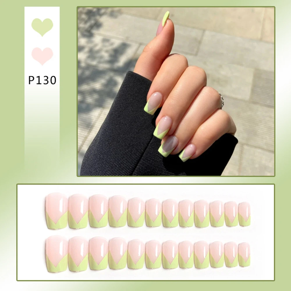 Накладные ногти с французской квадратной головкой, зеленый V-образный дизайн, искусственные ногти с клеем, полное покрытие, накладные ногти, 24 шт.