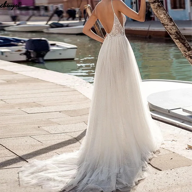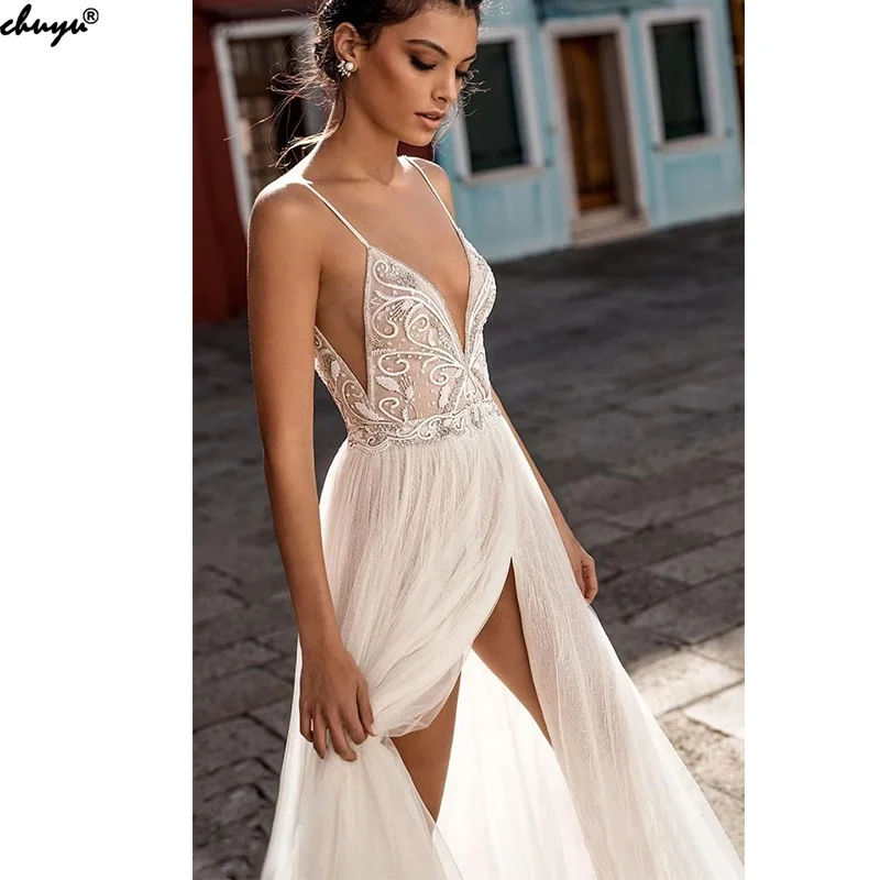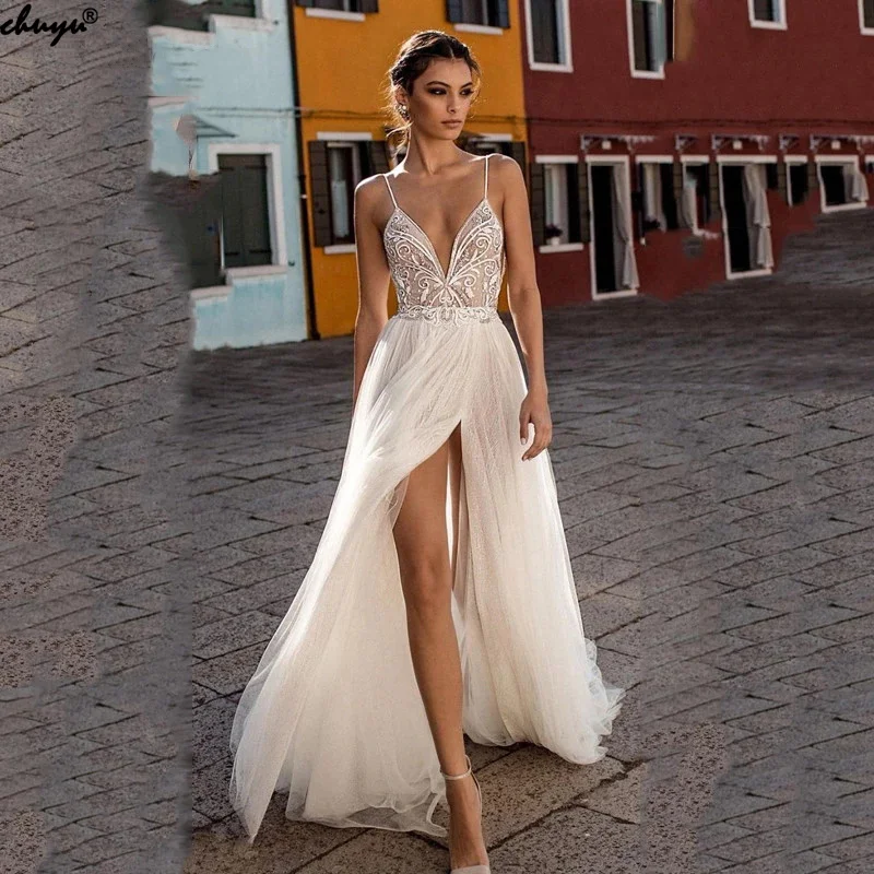 Сексуальное Тюлевое длинное свадебное платье-трапеция ChuYu на тонких бретельках с разрезом сбоку и открытой спиной для торжественных случаев, 2021