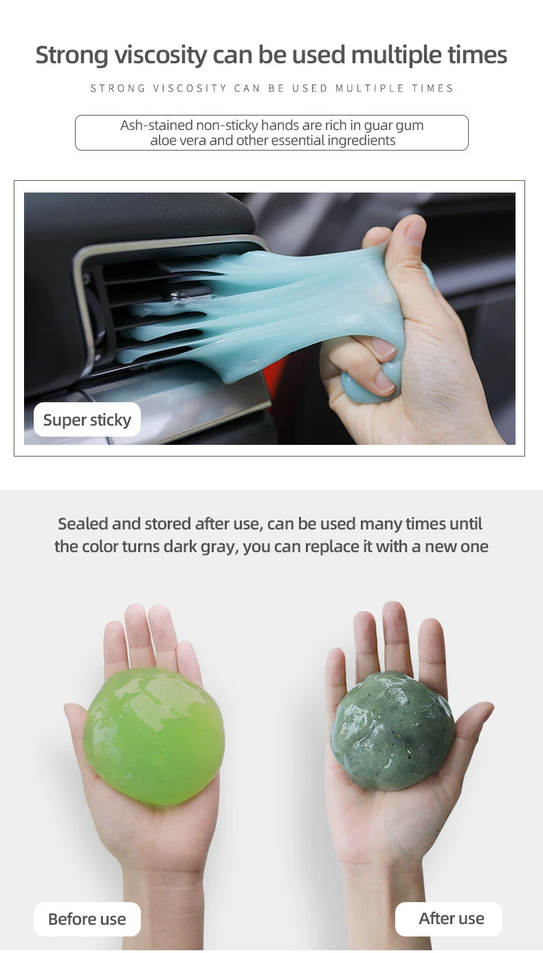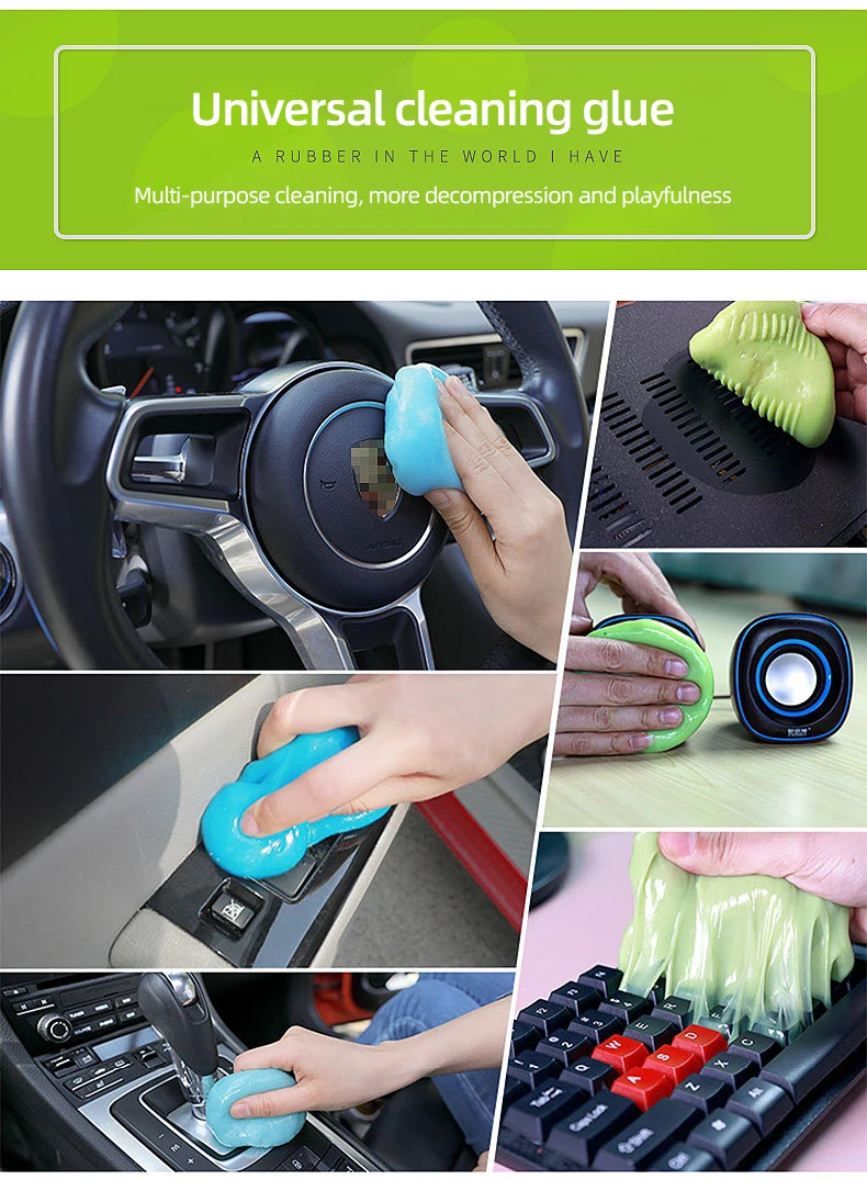 [Чистка автомобиля]Чистящий гель очень подходит для чистки автомобиля и очень подходит для очистки оболочки и черных точек автомобилей или грузовиков. Автомобильные гелевые очистители очень подходят для попадания в автомобильные вентиляционные отверстия, рулевые колеса, консольные панели, ящики для хранения, подстаканники, дверные ручки, отверстия и небольшие трещины в панелях, чтобы поймать грязь.[Простота в использовании]Просто аккуратно нажмите на автомобильный очиститель на поверхности пыли, медленно удалите гель для чистки автомобиля, грязь исчезнет, и пыль будет удалена с помощью очистителя клавиатуры.Гель для чистки автомобиля можно использовать несколько раз, пока чистая клавиатура не затемнена. После очистки просто положите гель для чистки клавиатуры обратно в коробку и поместите его в прохладное место.[Безопасность и охрана окружающей среды]Гель для чистки автомобиля изготовлен из биоразлагаемого гелевого материала, который является безопасным и экологически чистым. Чистящий гель удаляет пыль и мусор, не оставляя следов.[Широкое использование]Гель для чистки автомобиля также может использоваться в домах и офисах, компьютерных клавиатурах и других предметах, таких как принтеры, мобильные телефоны, калькуляторы, пульт дистанционного управления и мебель для телевизора. Подходящая поверхность должна быть водонепроницаемой, в противном случае Чистящая смазка прилипает к ней.
