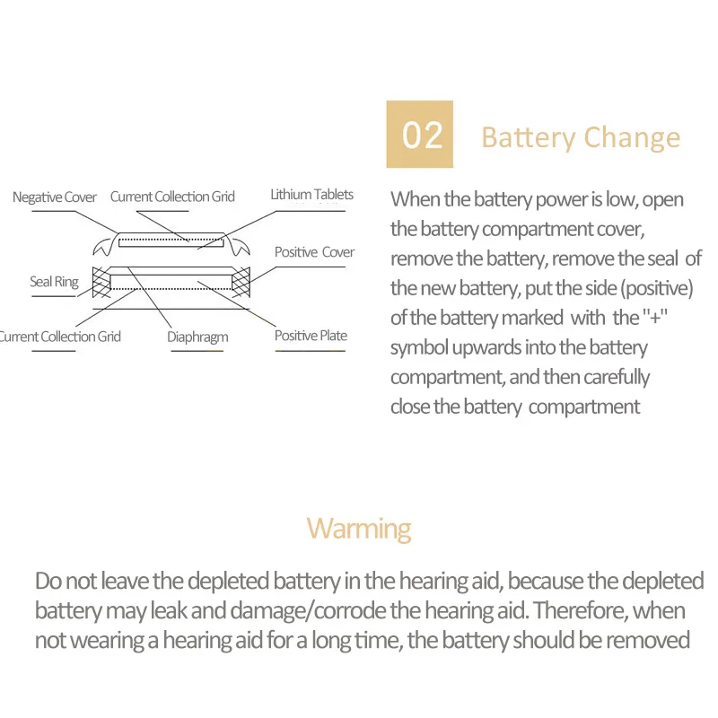 Специальная батарея для слуховых аппаратов-это цинк-Воздушный аккумулятор. При использовании цинкового воздушного аккумулятора сначала снимите наклейку на батарею и подождите минуту, прежде чем положить ее в слуховой аппарат, потому что батарея будет активирована только при полном контакте с воздухом. Перед формальным использованием батарея не должна быть подвержена воздействию воздуха. Клеящиеся уплотнения крепятся к батарее, чтобы убедиться, что батарея остается герметичной перед использованием.