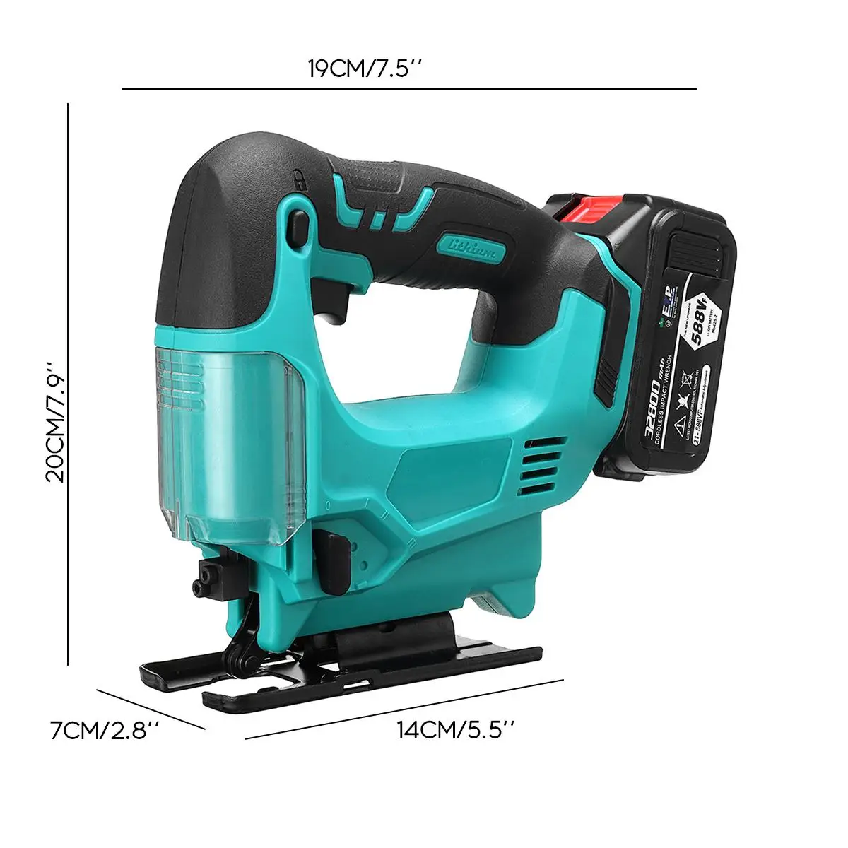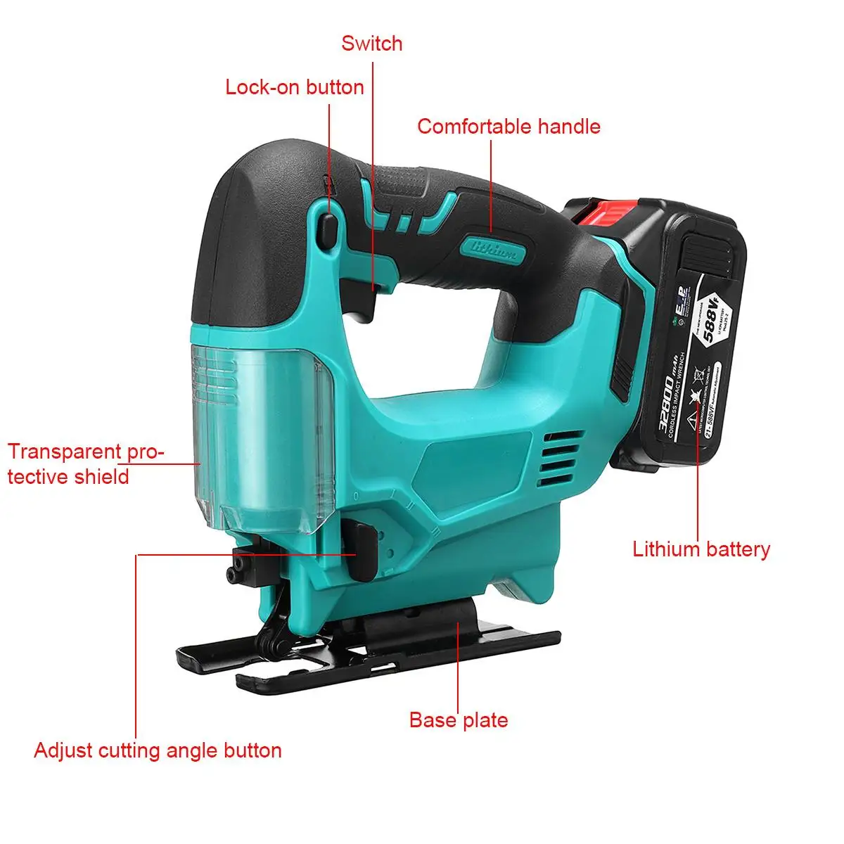 Спецификация:Номинальное напряжение: 220 ВЦвет: синийЕмкость аккумулятора:32800 мАчНапряжение батареи:588 вСкорость хода без нагрузки:350-3500 минут/оборотВозвратно-поступательный ход:26 ммМаксимальная глубина резки (мм):Дерево: 120 мм; Алюминий: 20 мм; Сталь: 10 ммОсобенности:-Угол косой резки можно регулировать для повышения эффективности работы.-Удобная рукоятка с углом обзора джига была протестирована много раз, чтобы улучшить удобство захвата.-Эффект спирального всасывания используется для быстрого рассеивания тепла, так что двигатель является прочным и не сжигает машину.-Двигатель с медным сердечником, высокая мощность и прочность, более быстрое рассеивание тепла.-Регулировка угла 45 ° удобна для резки, а угол резки можно регулировать в соответствии с требованиями.-Аккумулятор большой емкости 32800 мАч с одним часовым быстрым зарядным устройством обеспечивает длительное использование как дома, так и на улице.-Регулируемая подножка позволяет лобзику скошить до 45 ° вправо и влево, подходит для многофункционального использования. Клипса без инструментов легко и безопасный нож меняется в течение 2 секунд.Посылка включает в себя:Тип 1:1 x Беспроводная пила1 x пильный диск1 х гаечный ключ1 x защитные аксессуарыТип 2:1 x Беспроводная пила1 х литиевая батарея1 x пильный диск1 х гаечный ключ1 x защитные аксессуары1 х адаптерЗарядное устройство-1 шт.